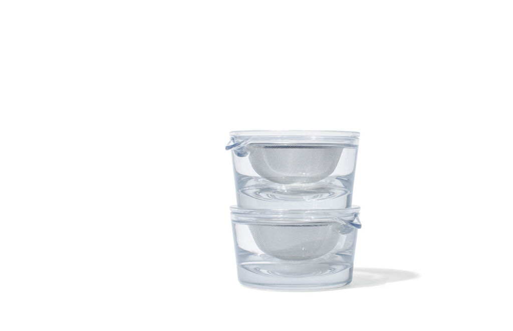 Designed for the individual tea preparation for one person, this space-saving stackable teapot can be filled with only 120 ml of water. The integrated strainer leaves ample space for the tea leaves to unfold, enhancing the development of the tea’s flavour. The thick-walled vessel is cast using a special resin moulding technique. It is as transparent as glass, yet virtually unbreakable. In addition, the material is not heat conductive so that the pot can do without a handle.