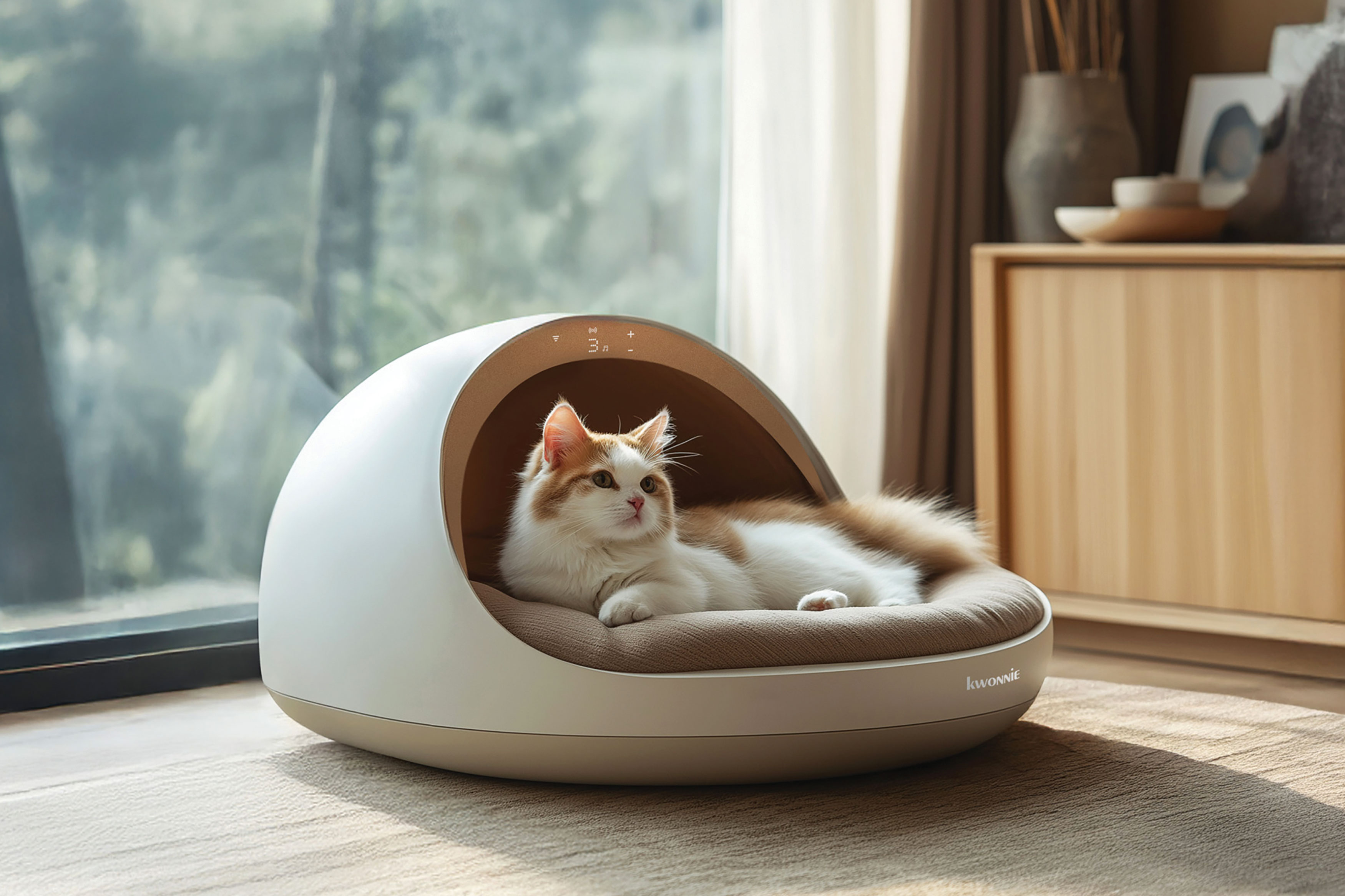 TranquilNest dual-zone cat bed uses Active Noise Cancellation and calming soundscapes to promote feline well-being. It features an open lounging section and a dome-shaped area. Its ANC system plays soothing audio while cancelling disruptive sounds in a frequency range that includes common household disturbances. TranquilNest reduces stress on cats' sensitive auditory systems, helping them experience less anxiety and sleep better. Red Dot Award: Design Concept | Concept | Pet Care, Furniture and Accessories