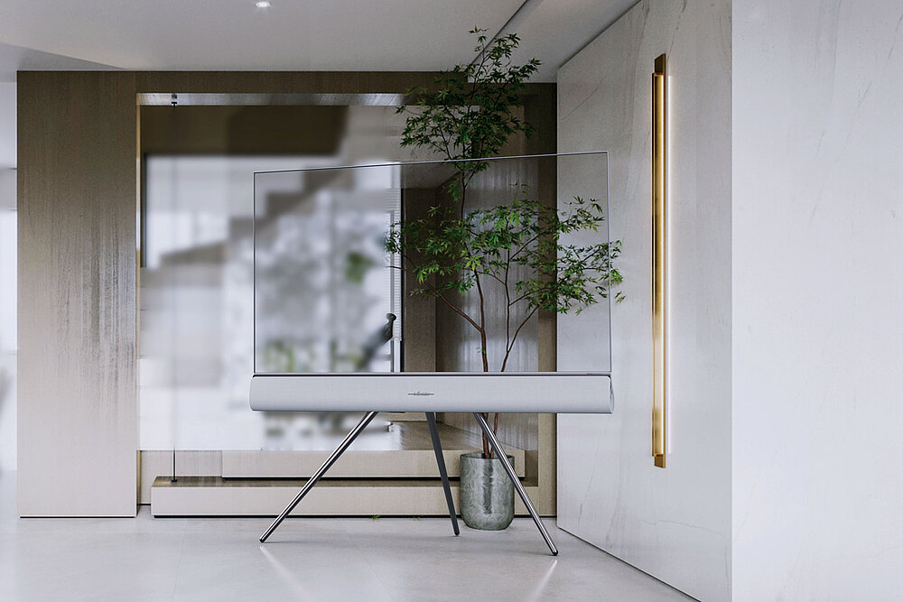 The TRANSPARENT OLED TV features an electronic control film with three modes: fully transparent, partially opaque, and opaque for optimal display. Users can switch modes to show diverse content, such as weather, fireplace, and nature scenes to create a unique home atmosphere. The TV combines powerful audio with its transparent display, making it an artistic and functional addition to any home.