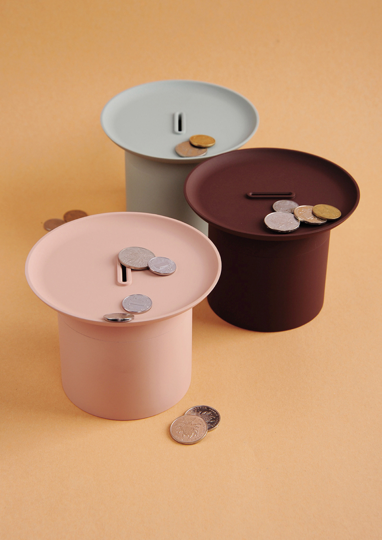 The design of the Tray Saving Pot includes a small tray with a coin slot on the top. This allows users to leave change on the tray for easy access. When the tray is full, the coins can be easily deposited into the pot like a “piggy bank”. This design is derived from the behaviour of how we store and hold change.