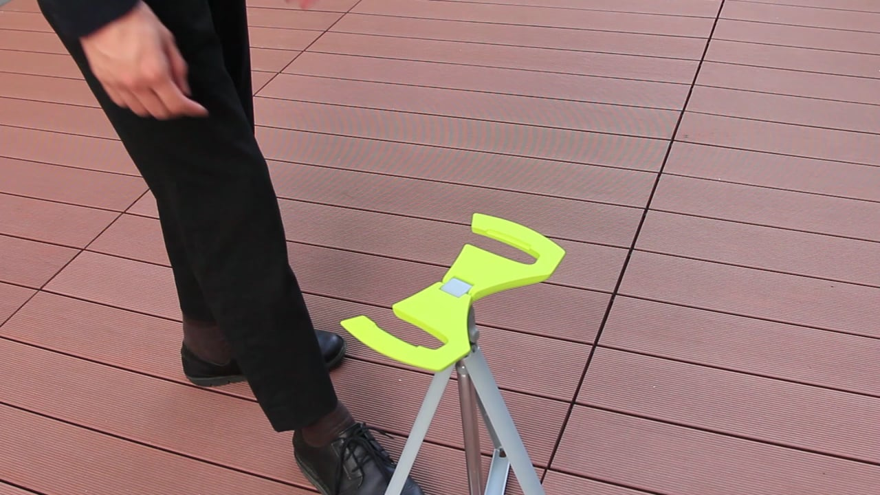 Tri Cane is positioned as a lifestyle product, rather than an assistive product. Elements of a chair, like the large seat area and split legs are greatly reduced. The supporting legs merge into a single stick form that is visually subtle. The unique folding mechanism of the legs is similar to that of a tripod and facilitates quick and intuitive operation. When the user gets tired of walking or standing, Tri Cane can be easily transformed into a chair. As a chair, the three supporting legs with a non-slip base provide stable and balanced seating. As a walking stick, the elastic base absorbs shock from the ground, which enhances the comfort of use.