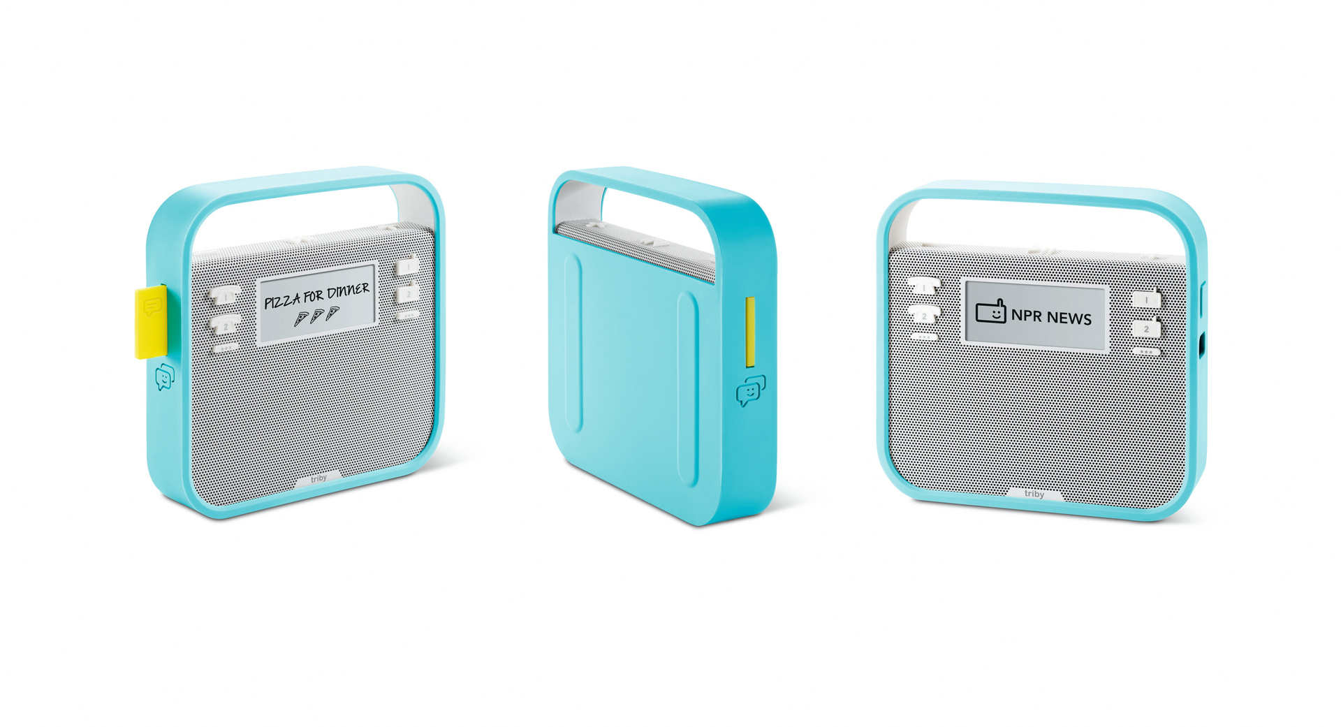 Triby is a Wi-Fi and Bluetooth speaker for the kitchen with integrated Spotify and Internet radio function. In addition, it supports VoIP telephony and Bluetooth hands-free calls for mobile phones. With its magnetic back, the device can be simply attached to the refrigerator or other suitable surfaces. A clever detail is the yellow flag that pops out at the side when a message has arrived.