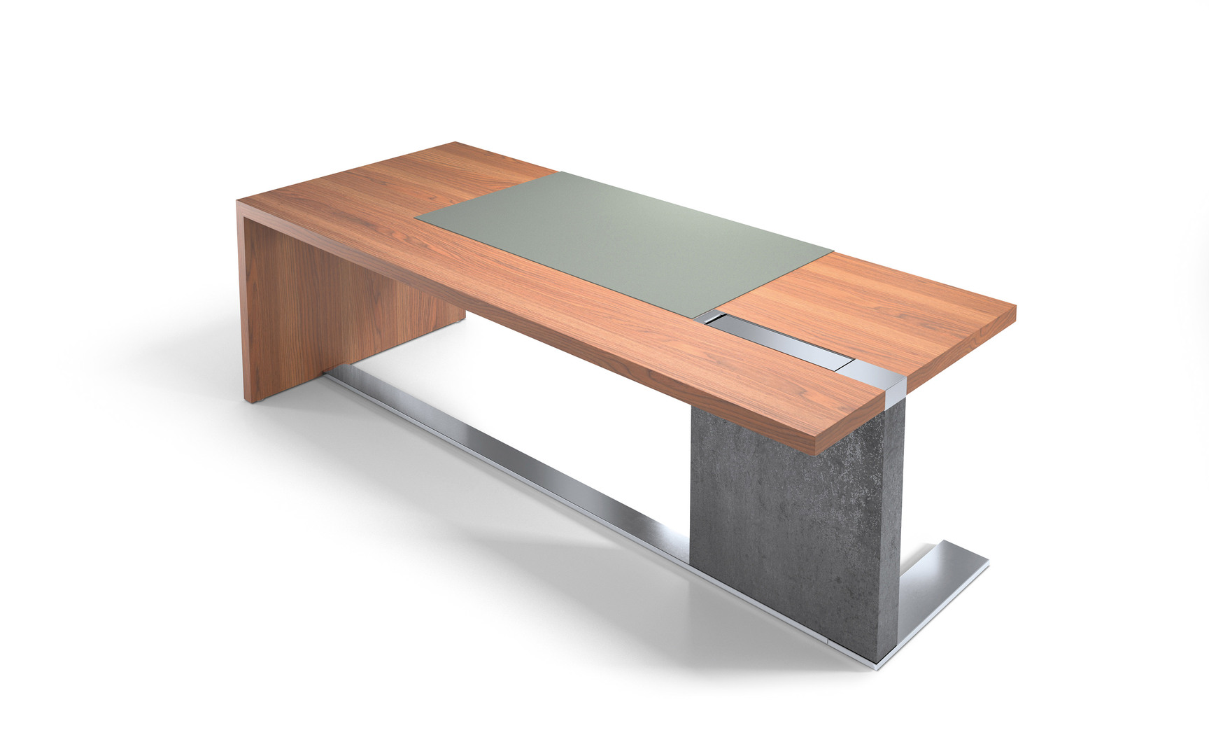 The dynamic appeal of this desk is based on its technical appearance with an asymmetrical shape. The choice of materials lends it a modern look: its elegant harmony is the result of an innovative balance of essential yet functional forms. The elaborate, desk-carrying wooden leg is elegantly clad in ceramic slabs and mounted on an L-shaped chrome-plated steel profile that houses the electrical wiring and intersects the top.