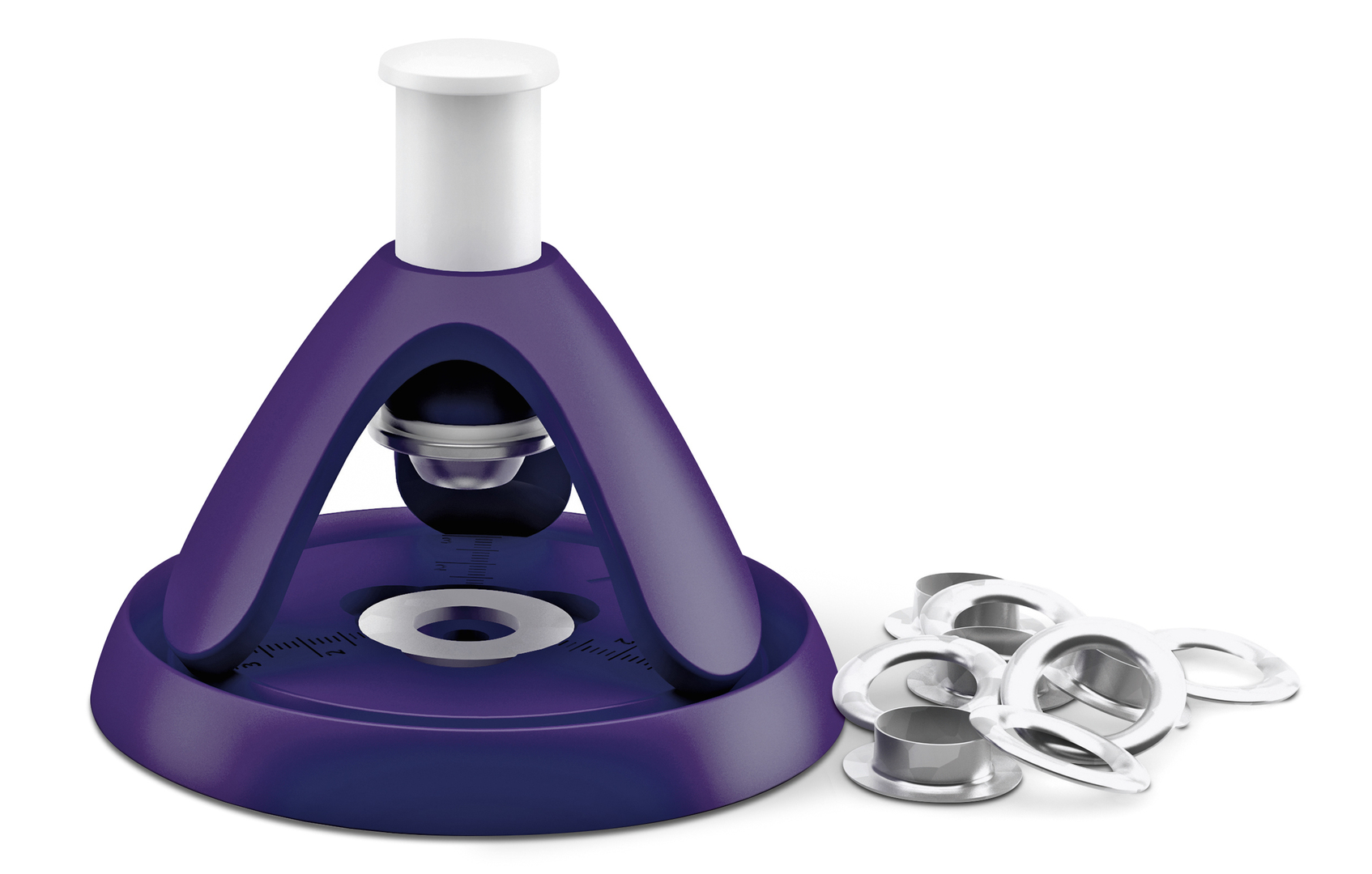 This Tripod is a device for manual punching and riveting using a hammer. The needlework utensil can be positioned anywhere on a textile surface. Its three feet make it very stable and provide optimal guiding and centring of the tools, thus achieving neat results. Up to 300 different punching and riveting inserts can be used together with the needlework utensil.