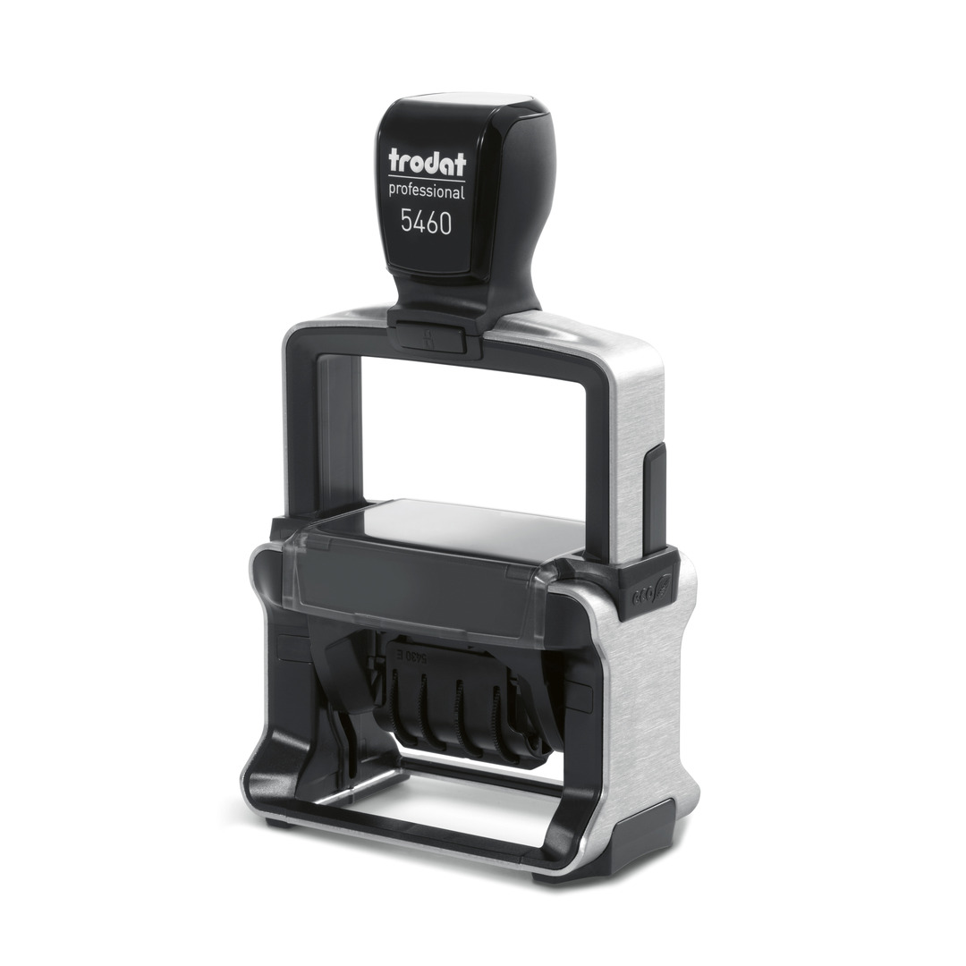 The design of the Trodat Professional 4.0 self-inking stamp combines strength, cleanliness and speed. The solid metal construction guarantees maximum stability and durability. The innovative finger protection keeps fingers clean when replacing the ink pad and setting the date. The optimised control curve ensures a consistent stamp movement and excellent print quality while the sleek design makes it easier to rotate the date wheels. Finally, the new band drive makes for faster adjustment of the date.