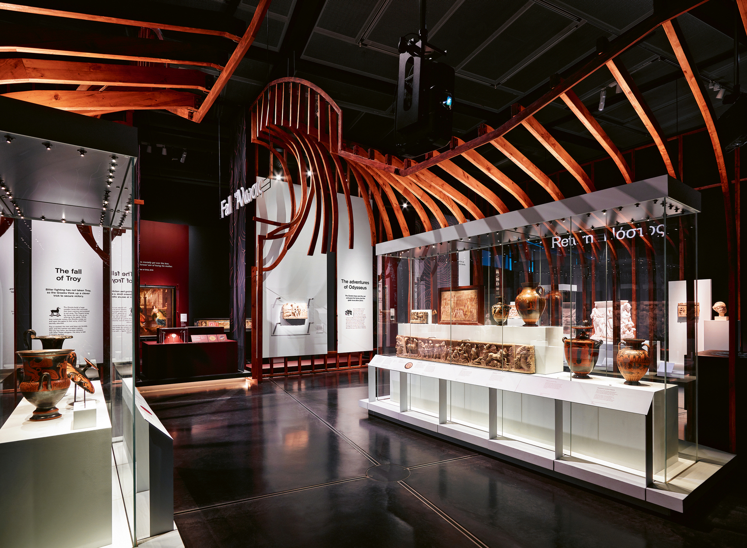 The exhibition “Troy: myth and reality” at the British Museum in London, England (November 2019 to March 2020) explored the significance of the subject of Troy and its appeal across time, asking: “Why does this story endure?” A clean, crisp design brought the astonishing objects in the exhibition to life. Dramatic lighting and colour palettes were used to complement the collections, while rich background colours aimed to help multihued paintings glow within the space. The nearly 300 exhibited objects spanned three millennia, from the museum’s impressive Greco-Roman artefacts to Heinrich Julius Schliemann’s original archaeological findings.