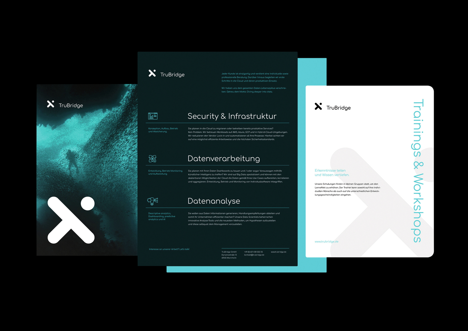 TruBridge helps companies to make the most of Big Data. Echoing their motto “Diving deeper into data”, the corporate design is all about diving. The company name refers to the freediver William Trubridge, whilst the key visual is an abstracted image of an underwater light reflection, all underscored by an aquatic colour scheme. The logo is derived from the letter T for TruBridge, the variable X and the connection to human beings, which is at the heart of any data cycle.