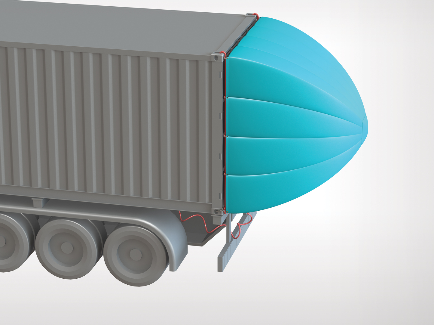 By improving the airflow Trucktail increases the fuel economy, and thus decreases the emission of CO2. The inflated bag is attached to two steel hooks which can be attached to the corner castings of an ISO-container. At the bottom, the rods are fixed to the container by a chain and a trigger hook or padlock. In the case of pressure loss, elastic ropes tie the inflatable cell to the container to prevent traffic disturbances. When not in use, the system can be kept in regular stow boxes for container trailers. The bag is inflated through the secondary air pressure circuit and can be quickly attached by one single worker. Similar but rigid systems are installed permanently to the trailer and can’t be used with container trucks, although the latter often travels the longest distances. Testing of these systems has shown that the mileage can be improved by 10%.