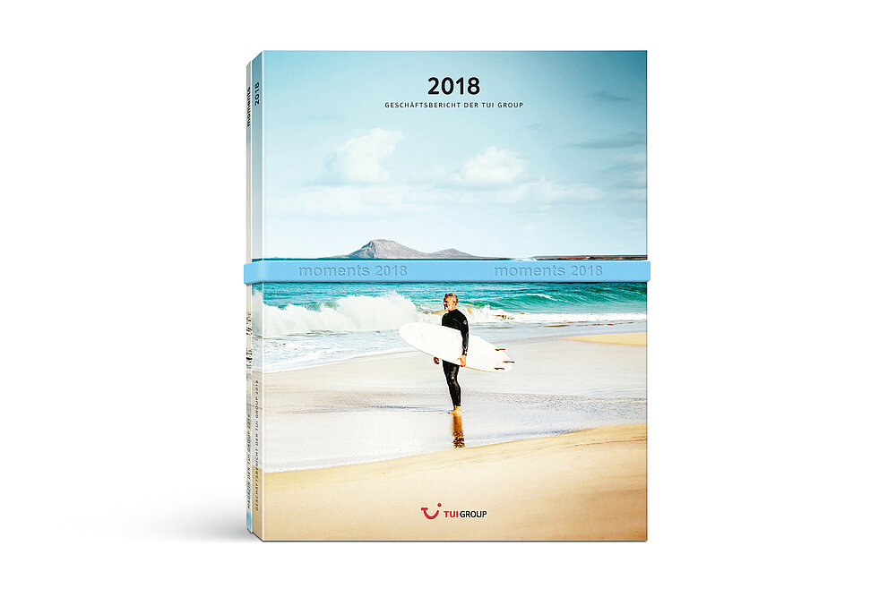 The TUI Annual Report 2018 was published in a set with a magazine. The banderole, which joins the two and has “moments 2018” printed on it, already points to the individual experience of travelling. The report’s cover design features an appealing snapshot which is tailored to the target group. In terms of content, the report covers a wide range of topics, from innovative technologies to new work situations for the company’s own staff. The business model is depicted as a group of islands across a two-page spread in the form of an infographic. This serves as a visual aid to help readers understand the group’s value chain.