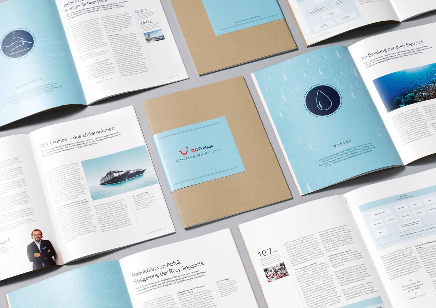 In 2013, the cruise company TUI Cruises published a report on the environment and sustainability for the first time. The report focuses on topics relevant to the cruise industry such as reducing emissions, water management and waste disposal. The clean and concise layout is mixed up by striking divider pages, featuring minimalist illustrations on the company’s brand colour. Using only 100 per cent recycled FSC-certified paper reinforces the publication’s message while also creating a special tactile experience.