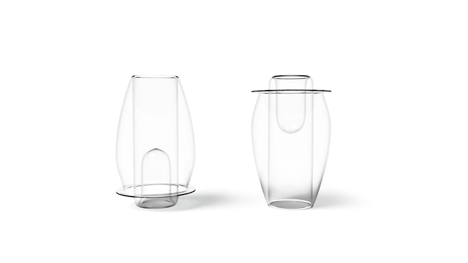 Tulip is a vase made of borosilicate glass, showcasing sophisticated movable elements which lend it high transformability. It is suitable for bouquets of different sizes: one variation offers enough space for a large bouquet while another is suitable for a small one. This is achieved by turning the vase upside down to make the inner smaller vase lift up within the water column. The edge can serve as a handle and guaranties easy carrying and facilitates the handling of the vase.