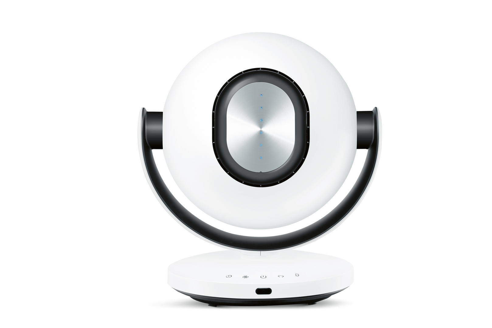 The high-speed rotation of the blades and the 3D air feed technology of this fan provide an even and continuous airflow, which imitates natural wind. Even the lowest power level ensures air movement in a room. An enclosed design hides the air inlet, making it water and dust-tight as well as suited to prevent injuries. The futuristic-looking spherical shape, the metal panel with flashing indicator lamps and high-quality materials convey the modern character of the fan’s design language.