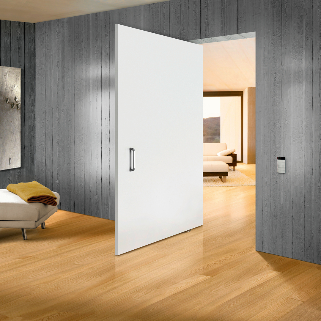 This door, as thick as a wall, proves that the door panel itself can also function as a design element. Constructed with a new, easy-to-mount pivoting mechanism and extraordinarily thick panels, the door takes on a completely new role. It becomes a sort of mobile wall. As the mechanism can be mounted on any type of floor (including those with under-floor heating), it is suitable for use in newbuilds as well as buildings of almost any age. The installation is simple and does not require much effort. The door can be opened 180 degrees, in other words 90 degrees in both directions. The mechanism is designed in a way that the door always closes automatically.