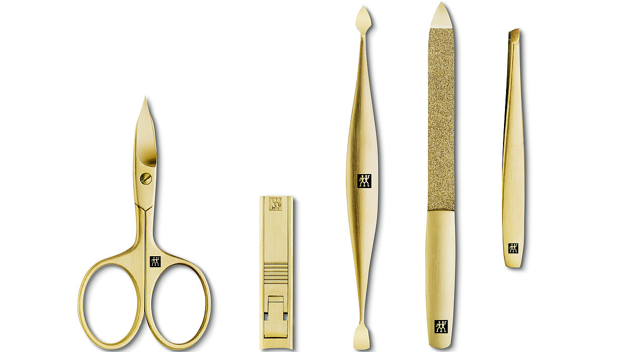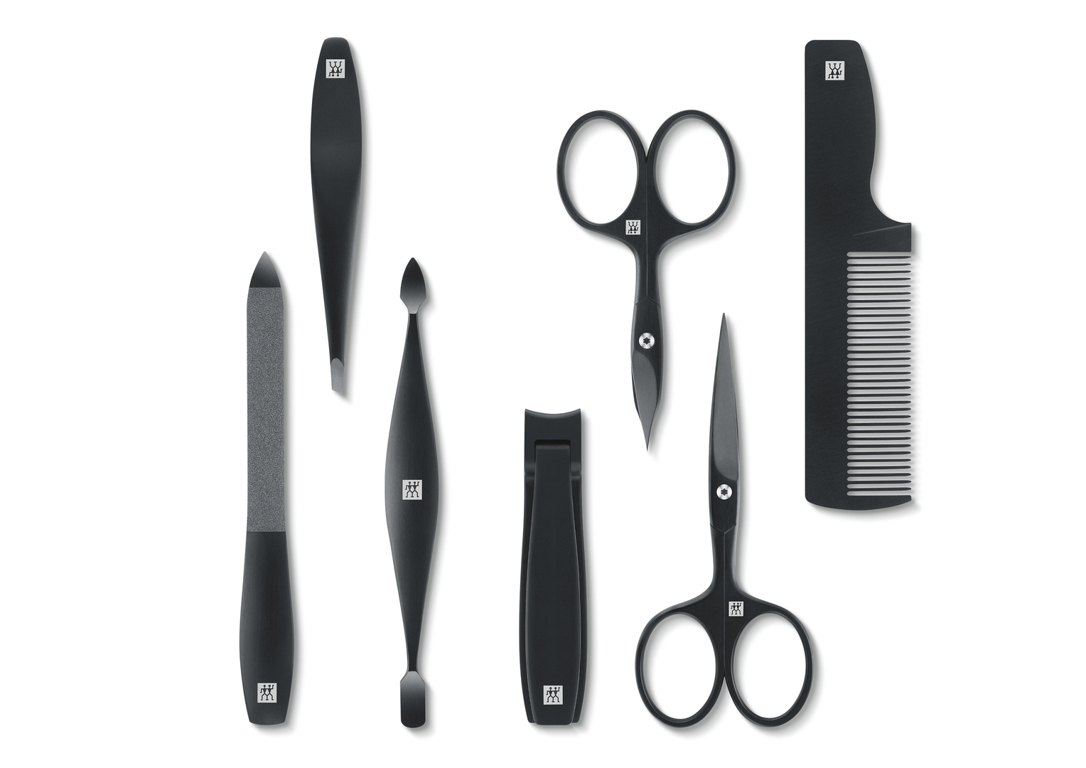 The TWINOX M line adresses especially the modern man: the tools for hair, beard and nail care with increased grip width sit very well in the hand and show a high-quality matte black finish. The scratch-resistant PVD coating gives the stainless steel tools an improved cutting performance and durability. The two-piece case made of black neat’s leather is equipped with a beard scissor and a comb. The versatile seven-piece case presents all instruments required for a comprehensive manicure, pedicure and facial hair grooming.