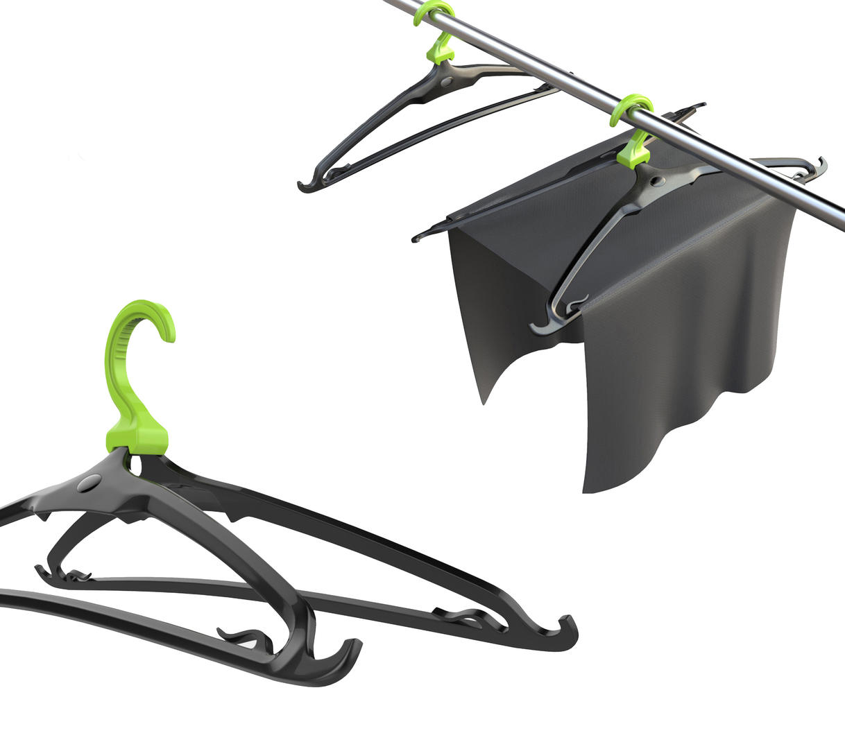 When drying normal lightweight laundry, normal hangers may work just fine. However, at times the fabric may stick together due to moisture, which slows down the drying process. When drying heavier fabric, sometimes the weight of moisture may even weigh down the fabric, resulting in garments that go out of shape. A solution is to combine two or more hangers to spread out and dry heavier fabric, but this takes up a lot of space. Twins Hanger is designed to manage this problem. A single hanger can open and split into two (at a 120 degree angle) while still attached to the same hook. This allows more air to circulate between the fabric, thus drying them more efficiently. This is a convenient and practical solution that replaces traditional drying methods and racks.