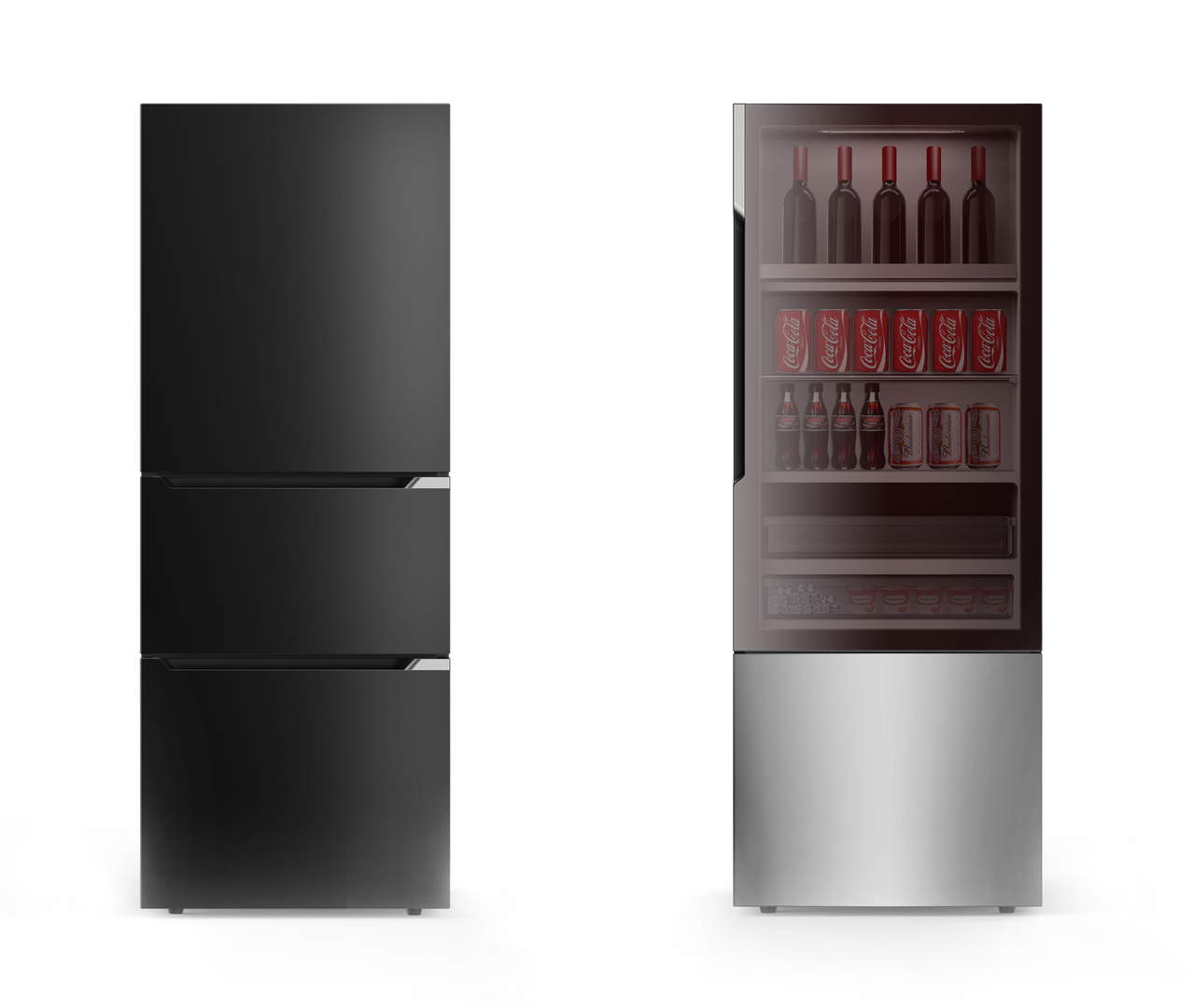 Designed for families living in small spaces, Twins Refrigerator combines multiple storage needs of refrigeration and wine storage in a single unit. It is designed to be placed between the kitchen and the living space, with two different elevation profiles that correspond to the storage needs of the respective spaces. The “kitchen zone” of Twins faces the kitchen space and has a refrigerator-like door profile. It meets storage needs of a kitchen with three compartments – fridge, freezer and a variable temperature zone for storing spices, vegetables, fruits, meat and other edibles. The “living zone” faces the living space and is designed as a temperature-controlled wine cabinet with some refrigeration compartments for tea leaves, beverages, dessert, ice and skincare products. Both the “kitchen zone” and “living zone” share a refrigerator box, but the internal space is divided and isolated to avoid cross-contamination of food and products. The sharing zone is designed as an independent drawer which can be accessed from both sides.