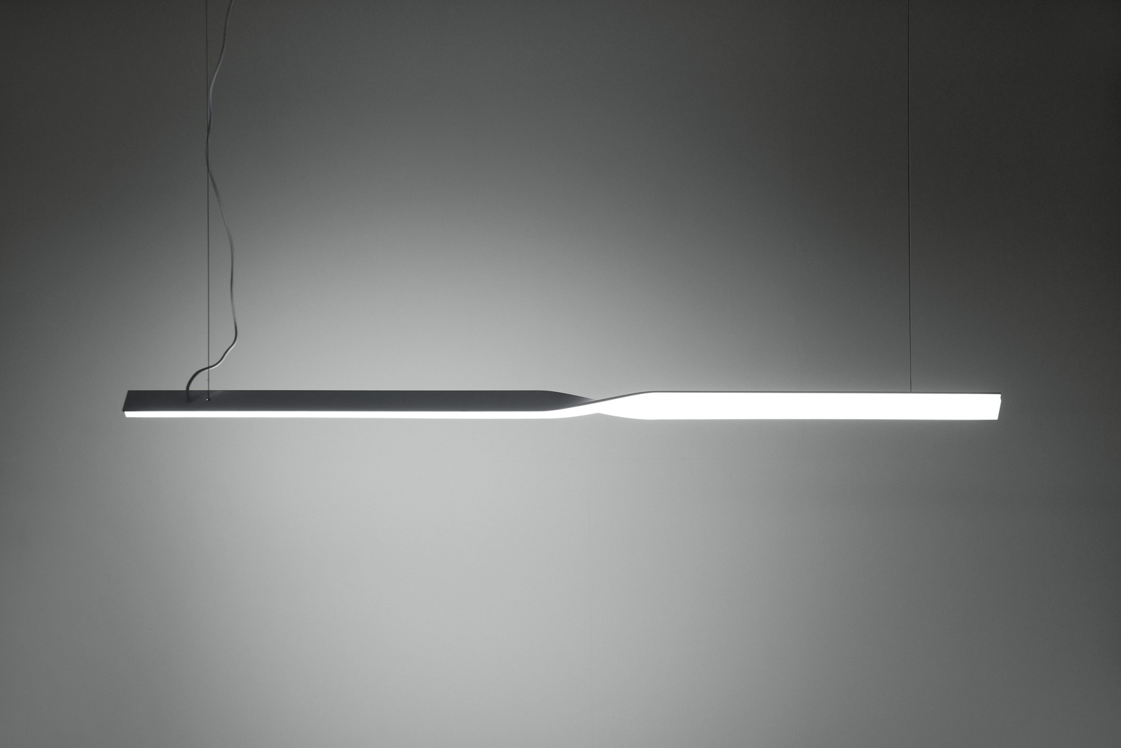 The design idea of Twist was to create a simple pendant luminaire which places the advantage of contemporary LED technology centre stage. Its flat profile allows illuminating different areas at the same time: balanced by two anchoring supports, the wings, made of twisted flat bars, lead the light efficiently towards the tabletop, creating an appealing room ambience and avoiding glare.