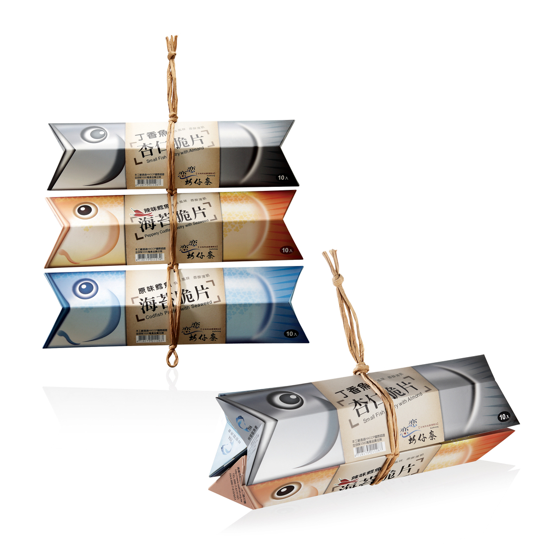 Taiwanese fishing culture inspired the packaging design of these seafood pastries. Each box shows a fish, with different flavours marked by different colours. With a string, two or three packages can be packed together as a gift set. This recalls the traditional way fishermen packed their dry fish to share with friends and family in ancient times. In this way, they shared not only the fish but also their happiness – an idea that the packaging promotes in a symbolic way.