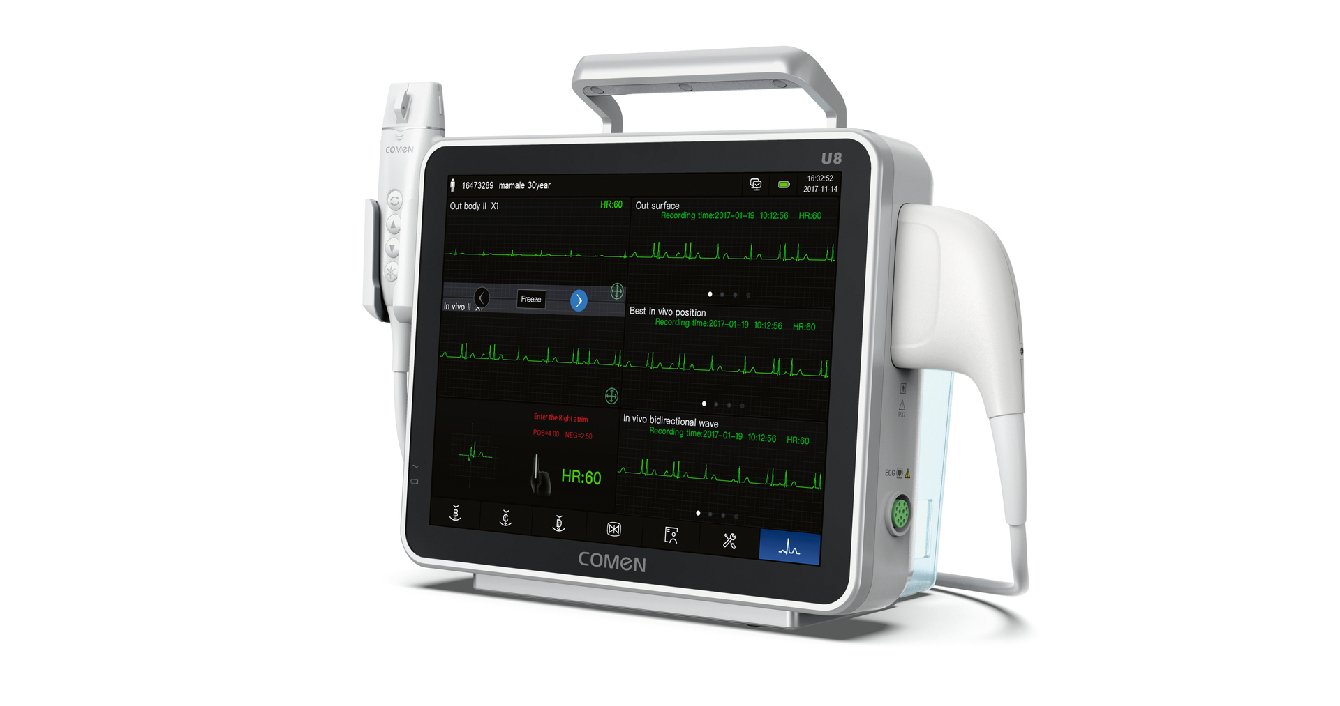 The U8/U8B medical device combines ultrasound and ECG diagnosis, enabling faster and more comprehensive analysis of a patient’s health status. The compact 12.1” screen displays content in high resolution and thus provides better access to the ultrasound and ECG information. The user interface combines the touchscreen with a probe key to optimise the user experience. This is further supported by one-touch switching between the two input methods. The graphic design is easy to understand, allowing users to become familiar with the product quickly.