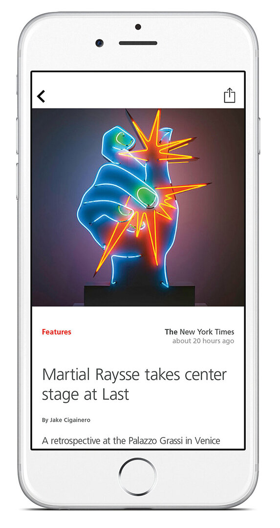 The UBS Planet Art app was developed as a news-feed reader and a tool to navigate through the world of contemporary art on an iPhone or iPad. Articles from more than sixty high-quality sources are indexed and analysed by a unique data engine, and stories on various topics, artists and cities can be explored. The principle of how art galleries exhibit art works, with an image and a little white label with information, was applied throughout the core design of the app to create a visually compelling user interface and an experience that focuses on the user’s journey in a clean, sleek and minimalistic approach.