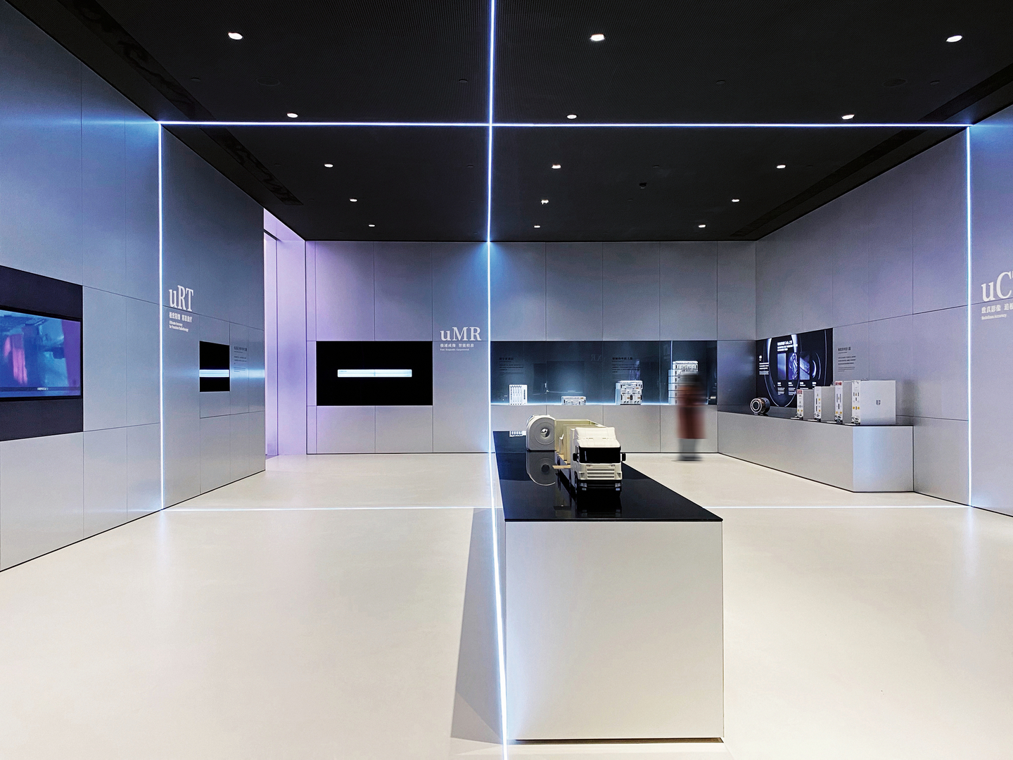 United Imaging Healthcare is a provider of high-quality medical equipment. The aim was to create an emotionally appealing exhibition space for the new production site in Wuhan, China. The elliptical exhibition room was placed at the heart of the impressive showroom and conveys a poetic minimalism. The design benefits from the eight metres high ceiling and a 3,000 sqm area free of pillars. The space is virtually devoid of visible seams or load-bearing elements. Along with the predominant use of white and grey, matte surfaces prevent reflections. Upon entering, the visitor thus becomes a tiny dot compared to the vast space and the machines presented.