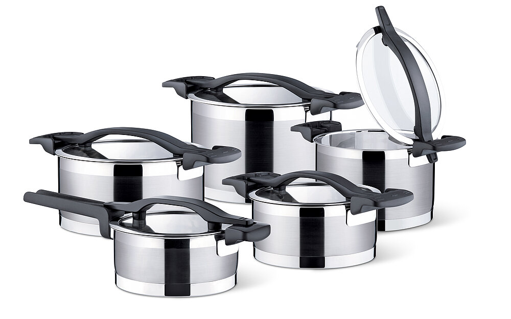 A functionally well thought-through design concept characterises this cookware series. The flexible handling of the lid enhances usability considerably.