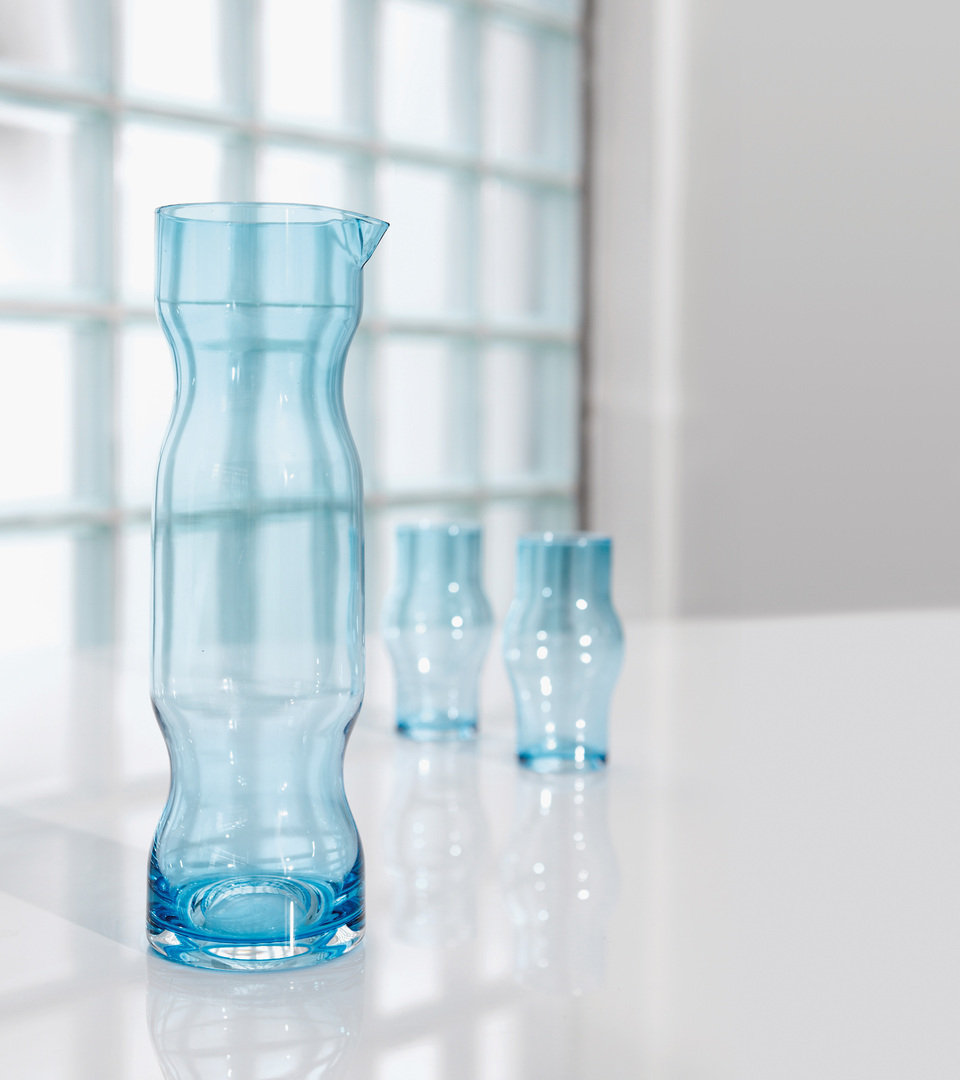 With their soft lines and traditional manufacturing method the glass vessels present water in an elegant and respectful manner.
