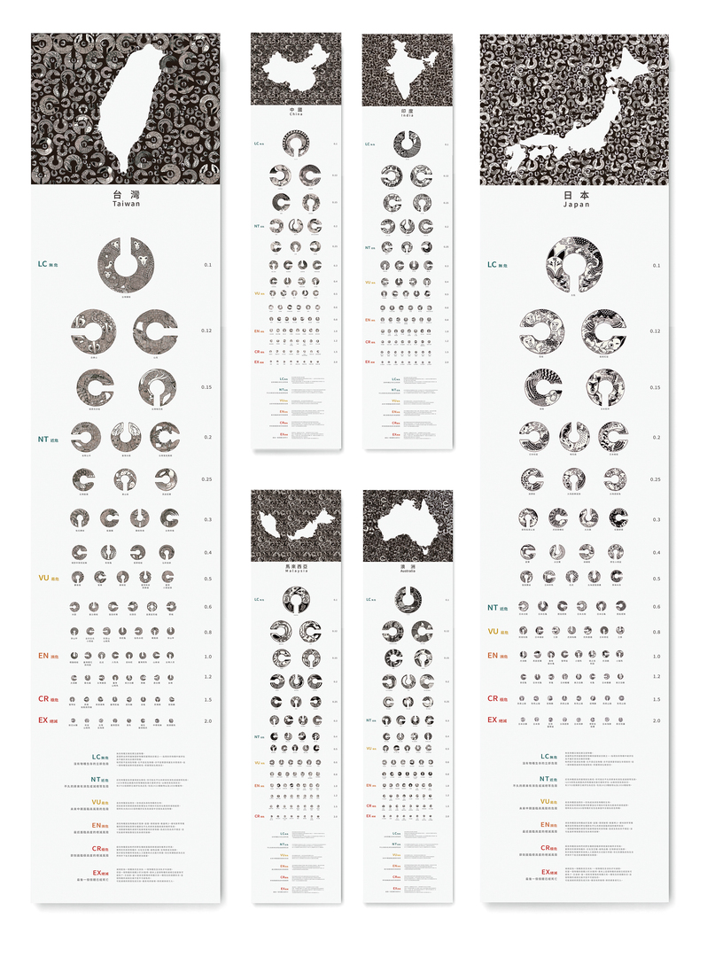 In order to draw attention to animals threatened by extinction, this meticulous work uses the idea of diminishing vision. The eye charts on the posters contain tiny black-and-white drawings of more than 800 endangered species. The more endangered a species is, the smaller it is depicted on the chart. Each of the twelve posters represents a different country, featuring the country’s outlines in the header and a country-specific drawing style, such as the style of Aboriginal dot paintings or Mayan art.