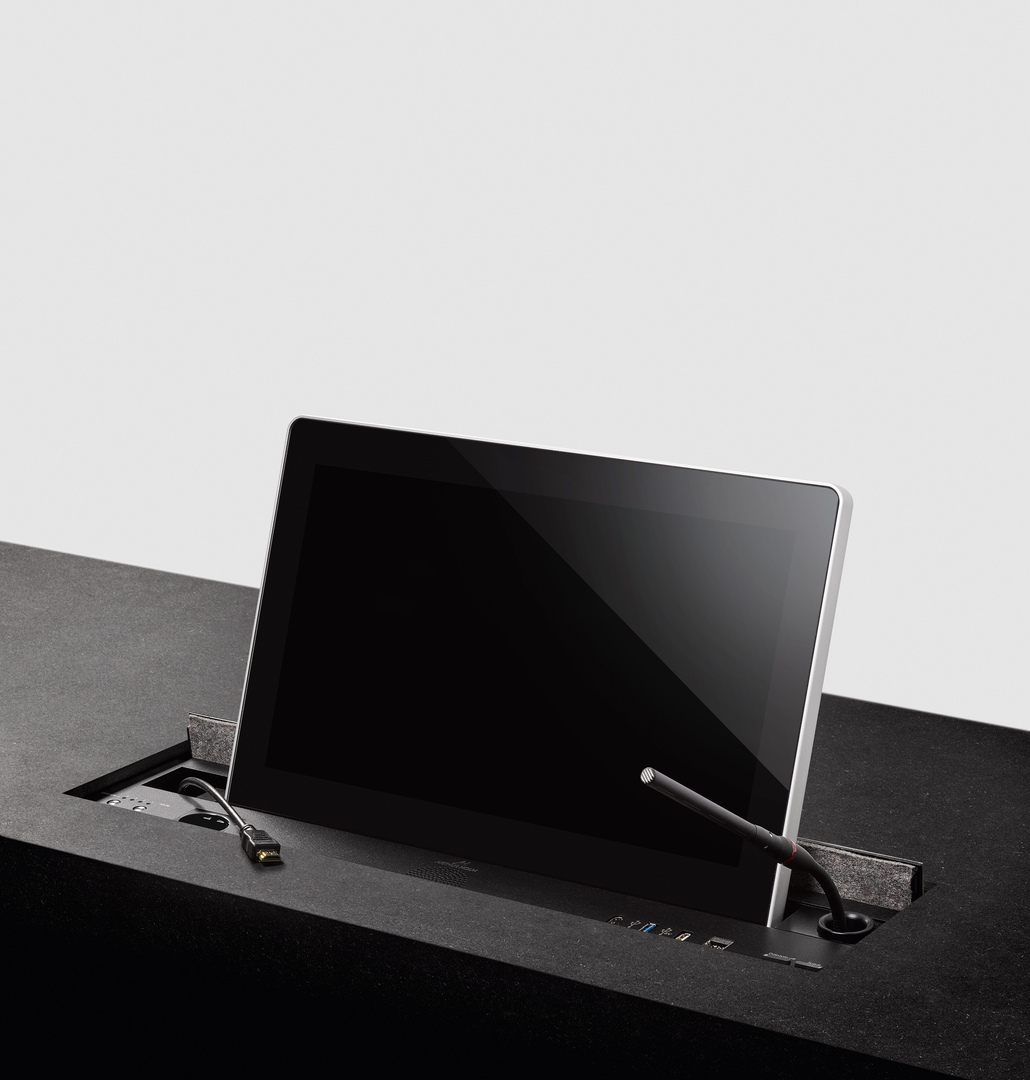 UnderCover is a conference system cover plate that includes a monitor and several interfaces. When the monitor is in use, the cover plate automatically and smoothly recedes within the meeting room table, to be completely hidden. When not in use, its back-cover fits flush with the table and serves as a closed work surface. The cover plate can be veneered to match the furniture and create a uniform look. The most striking features of the monitor are the hand-milled aluminium frame and the HD touchscreen.