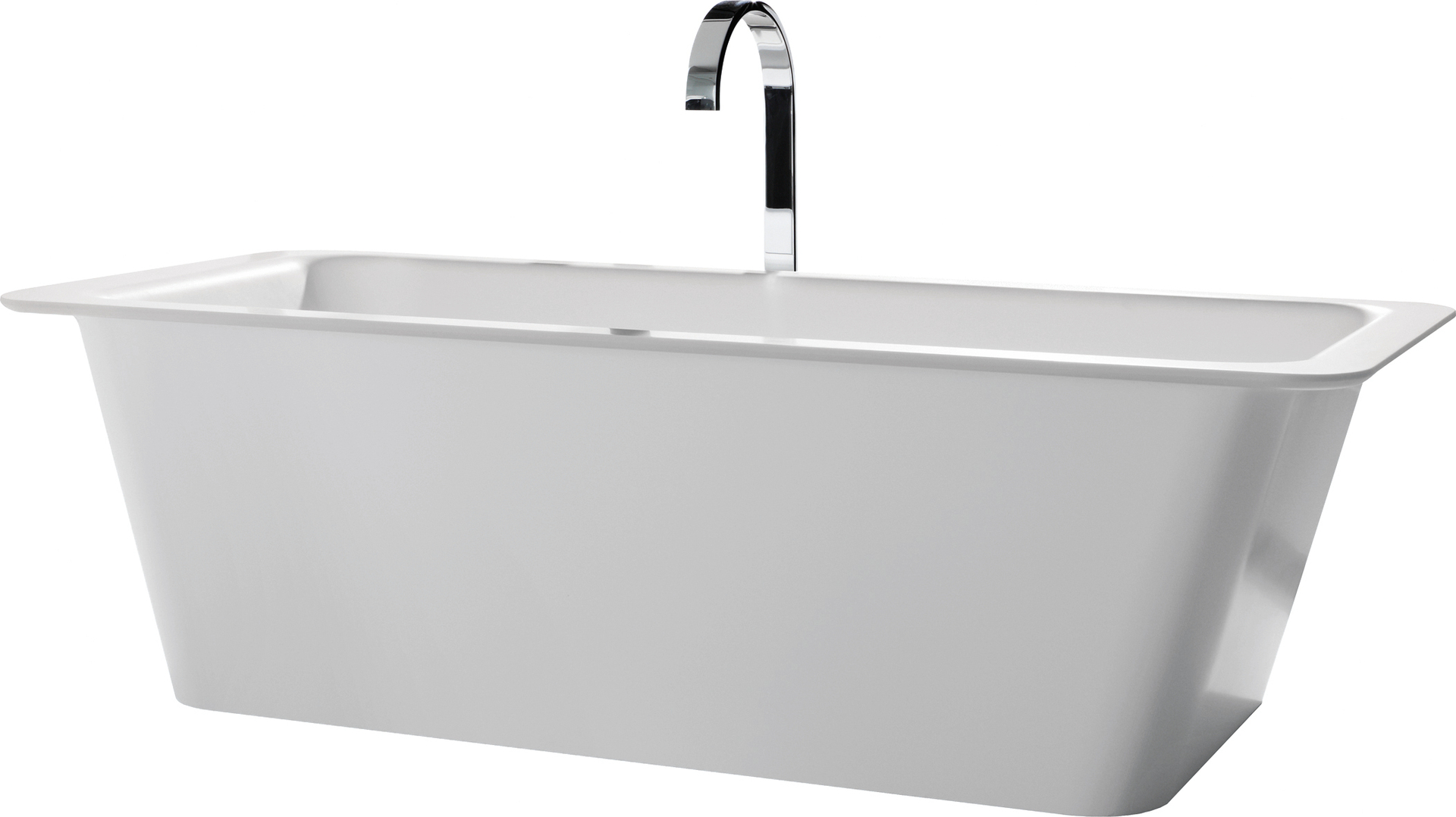 This free-standing bathtub is cast in one piece from a single mineral material. The stone-like nature and feel of the material convey durability and quality. The basic idea behind the design is one of straight lines. A distinctive feature of the bathtub is the way it opens up in a chalice shape. Despite the thinness of the material, it nonetheless has a wide rim, which invites to step in. The rim itself has a precise outer edge creating a clear separation between the interior and exterior of the bathtub.