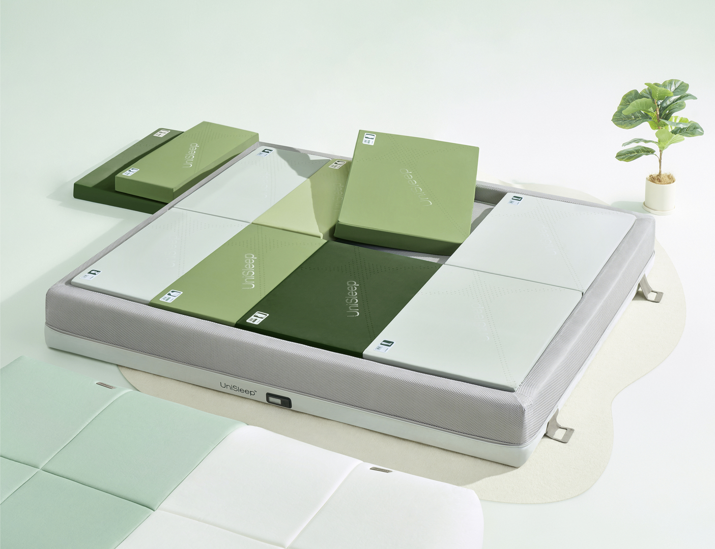 The modularly designed Unisleep Cubed Modular Mattress features eight different firmness levels, with four sections on each side of the bed. This design ensures customised support for various body areas. In the event of excessive wear, individual modules can be replaced. The various shades of green not only provide visual differentiation, but also give the double mattress an attractive appearance. Additional features include a replacement reminder device and exchangeable toppers.