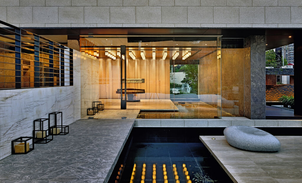 The aim of this project for the renovation and re-development of a building was to create a public space for interaction, meditation, etc. The focus was on promoting a coming together of people, people and architecture, as well as people and nature. The intention was to overcome the boundaries between interiors, architecture and landscape and allow these areas to merge. For this reason, the design uses frameless glass windows and integrates a landscape pool, which extends into the interior, while a marble wall inside becomes an exterior wall.