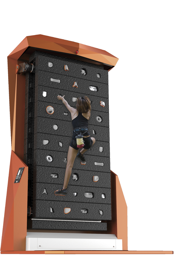 Unlimited Climbing is a track-type rock climbing “wall” that combines the principle of a treadmill with a rock-climbing wall. It is not limited by the height of the room and can be used for arbitrary climbing practices. Set with different levels of difficulty, the grip points are changed randomly to generate a combination and permutation of climbing challenges. The Unlimited Climbing is convenient, safe and does not require a large space to create different rock faces. So compact in size, it can be placed in a variety of indoor environments. This product has a built-in intelligent recognition system. There are also three preset modes to choose from: the simple mode where the climber does not have to control his speed, a general pattern mode where the climber is free to set a speed, and the challenge mode with a wall surface that can tilt to a maximum of 15 degrees. With help of a sensor and the coordination of a central processor, Unlimited Climbing is capable of path planning and indicates the path with LED lights. Each path is random and unexpected, bringing new challenges each time. When the bigger module passes through a built-in infrared detector, a grip will emerge that corresponds to the LED lights. Each big module is set with a pressure sensor that once having detected a new position will slowly refresh with new modules in a new combination.