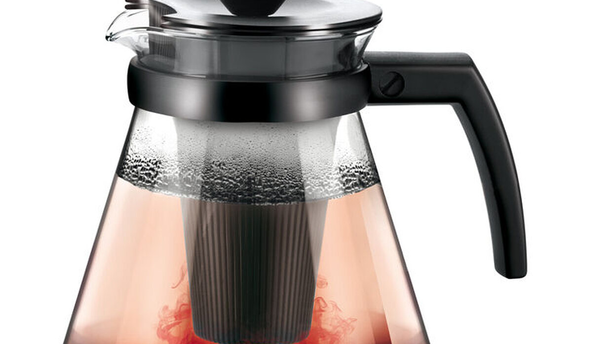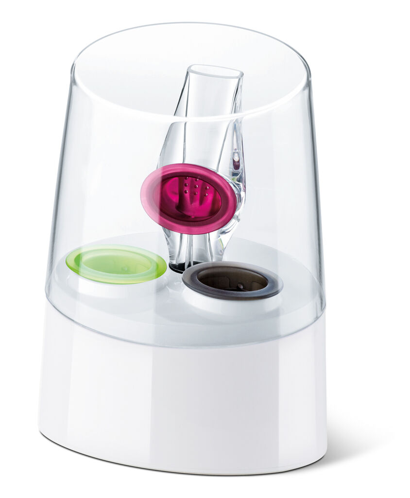 Thanks to its exchangeable valves, the Uno Vino can oxygenate various types of wines in an appropriate way while the wine is being poured into the glass: the red valve, which has nine openings, is perfect for red wines, while white wines are oxygenated using the green valve, which has three openings. The anthracite valve, which has no openings, serves as a spout for rosé wine. The aerator as well as the valves are kept in a convenient stand. Users simply need to attach the appropriate valve before serving the wine.