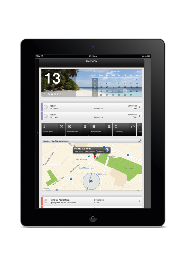 The CRM.pad app allows sales representatives to access their customer data anytime, anywhere. The mobile version of update’s customer relationship management solution provides the functional essentials, while taking advantage of the benefits of the iPad. The dashboard displays CRM data and an overview of current tasks, visits and locations. With customer master data and contact histories at their fingertips, sales representatives can focus on what they do best: engaging with customers.