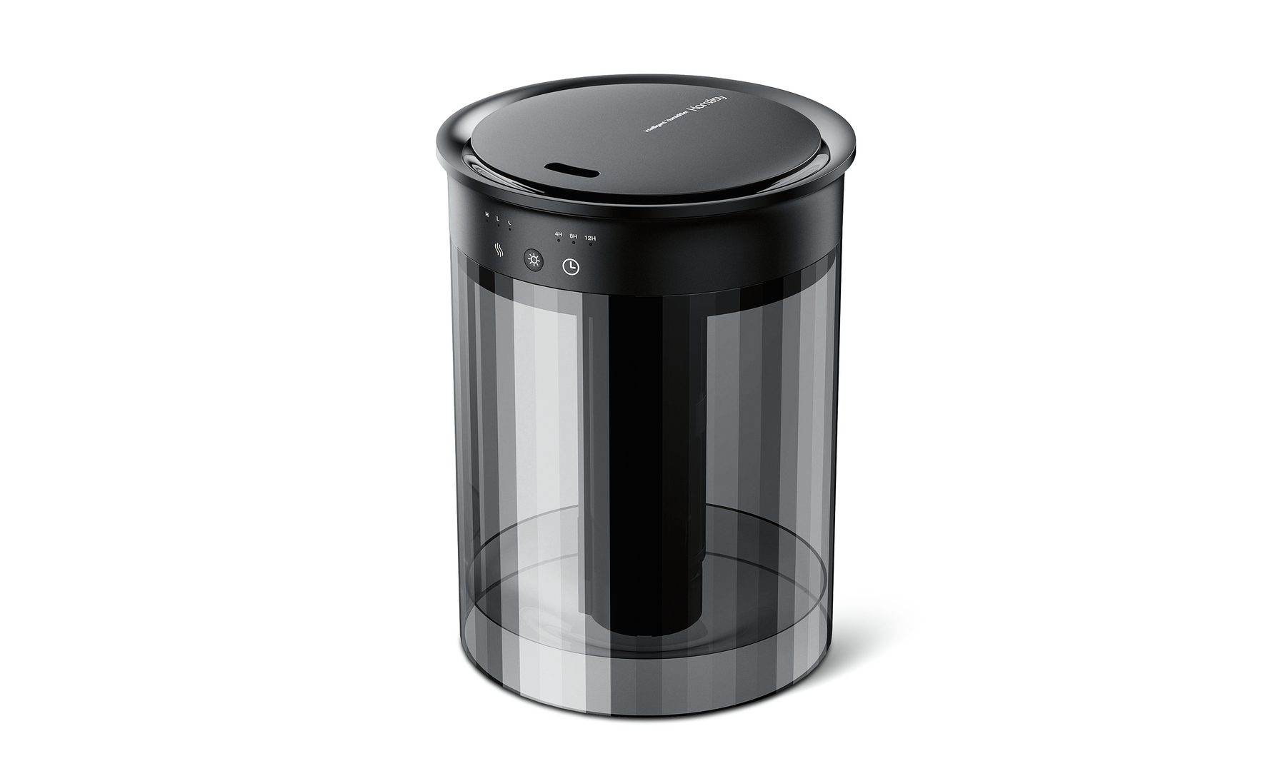 This humidifier is characterised by a two-part design concept: the control unit with its connected waterproof atomising head is located in the upper part, while the water tank forms the lower part. Thanks to its smooth, cylindrical shape, the water tank is easy to clean, so that no deposits form in concealed places that could contaminate the water. The nozzle can be rotated by 360 degrees to direct the water vapour in any desired direction.