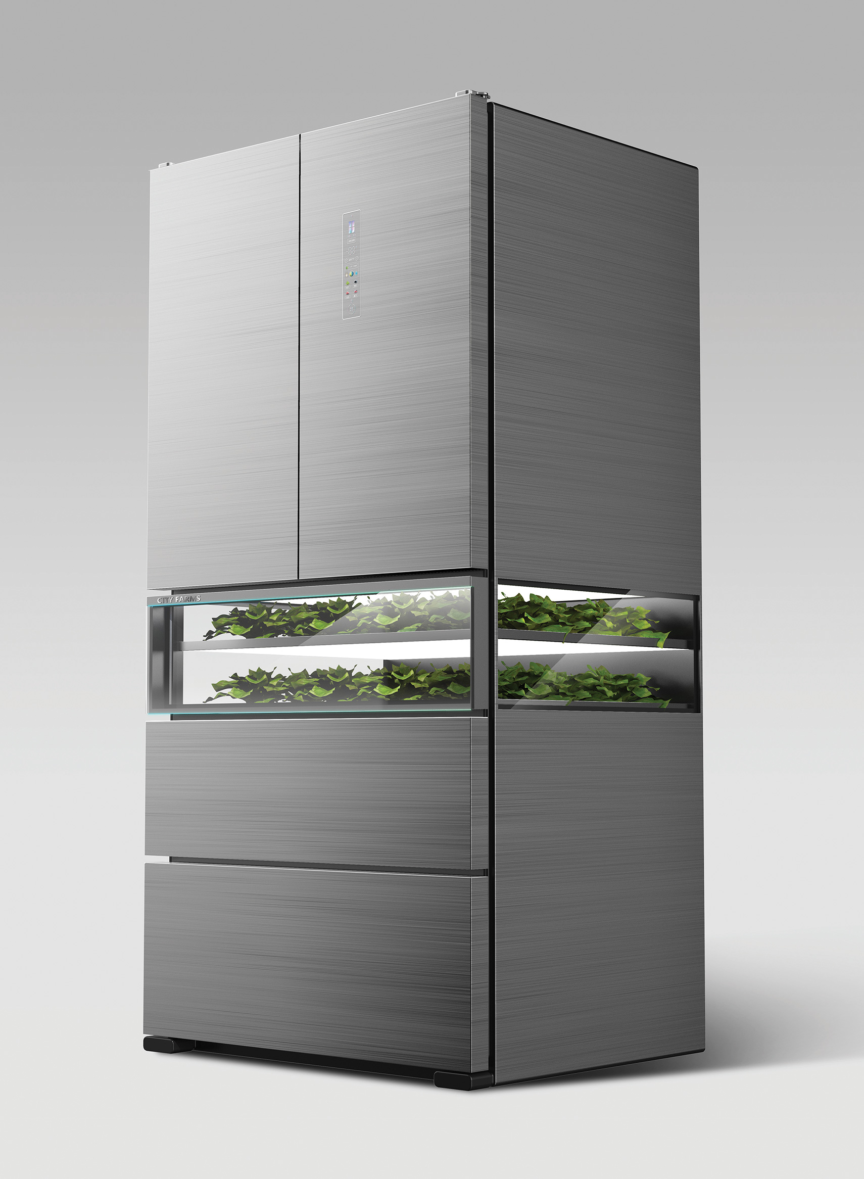 URBAN FARM REFRIGERATOR includes sections for refrigeration, freezing, and cultivation of homegrown vegetables. It recycles condensation and defrosted water to nourish plants, creating an eco-friendly cultivation space. Users access fresh produce via drawers and interactive areas provide growth records and healthy pairing suggestions. The transparent design integrates water recycling and soilless cultivation, promoting sustainable urban agriculture while reducing transportation and emissions. Red Dot Award: Design Concept | Concept | Kitchen Appliances and Accessories