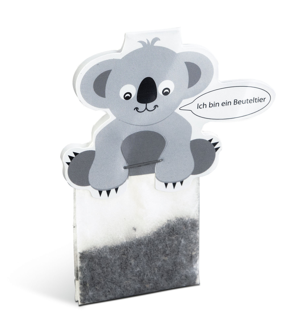 This packaging design combines the pleasure of a cup of tea with a charming promotional idea. Each flexibly printable paper tea holder can be fixed to the edge of a teacup such that it is clearly visible. Increased stability due to folding also enables printing on both sides. Due to this design, extravagant advertising messages receive a high level of attention during the preparation of the tea and thus will be easily remembered. Each tea portion, together with the promotional figure, is packed in an individual, aroma-proof, transparent bag. Various seasonal motifs and tea flavours are available.