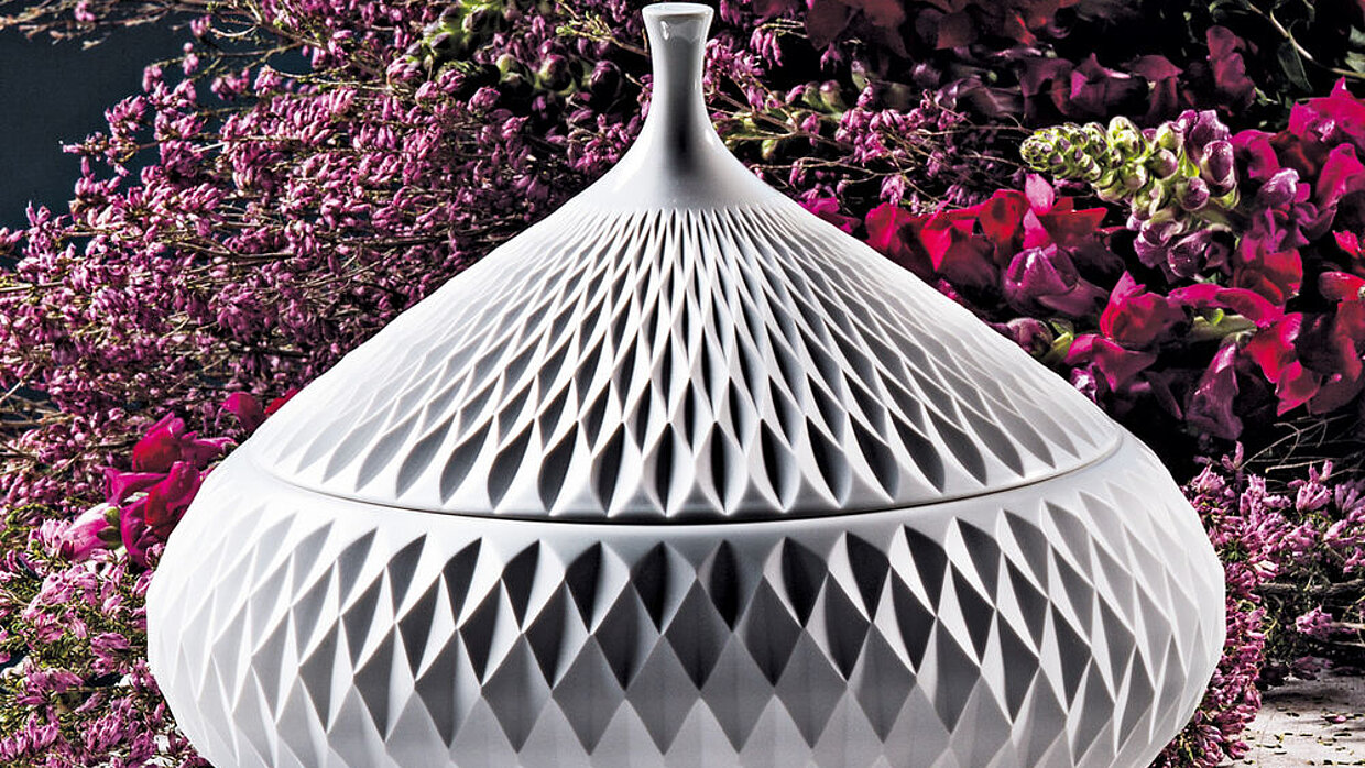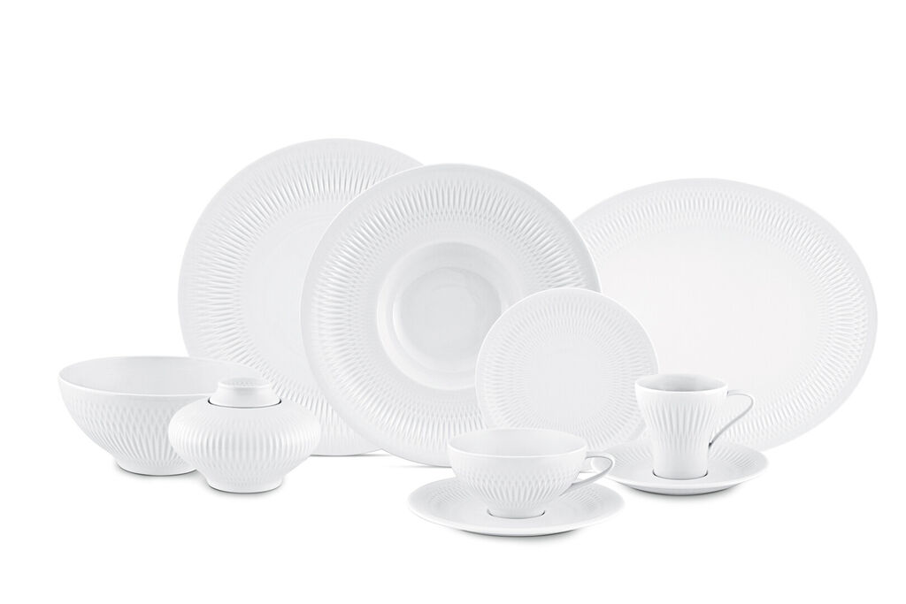 Inspired by Japanese geometries, the Utopia porcelain set features a relief-style décor which flexibly adapts to different contours, emphasising the curved shape of the plates as well as of the cups and other vessels in an appealing manner. Furthermore, their filigree reliefs are reminiscent of an artistically folded origami table decoration. As an expression of its quality, the high-gloss polished porcelain comes in a bright white.