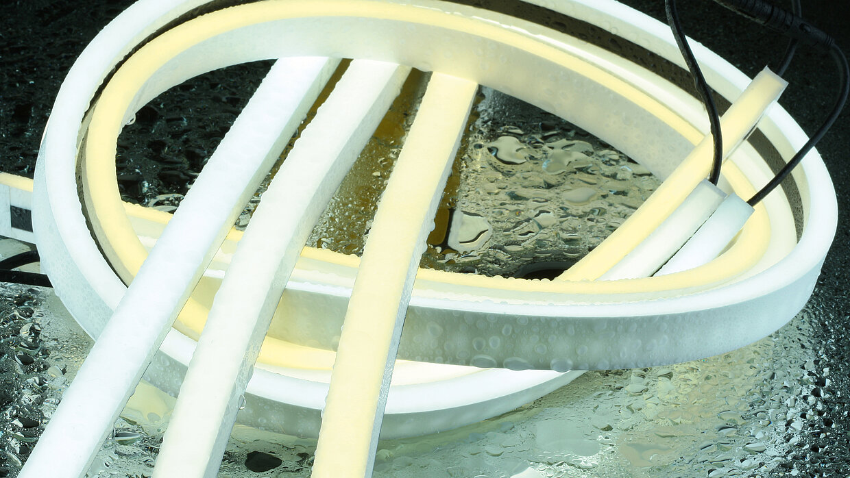VarioLED Flex Amor is a miniaturised, opal encapsulated, flexible LED design light line. It is the uniformity of the light in combination with a very small cross section of only 5 mm width x 13 mm height that characterises Amor. It is horizontally bendable with a minimum radius of 3 cm. It also offers easy installation, high resistance against salt water and UV-light, and the connection of individual luminaires with a nearly seamless light-to-light transition. The LED light line is suitable for a variety of applications in the areas of drywall and furniture construction, decorative accent lighting, and exterior façades. The installation of the luminaire does not require any substructure.