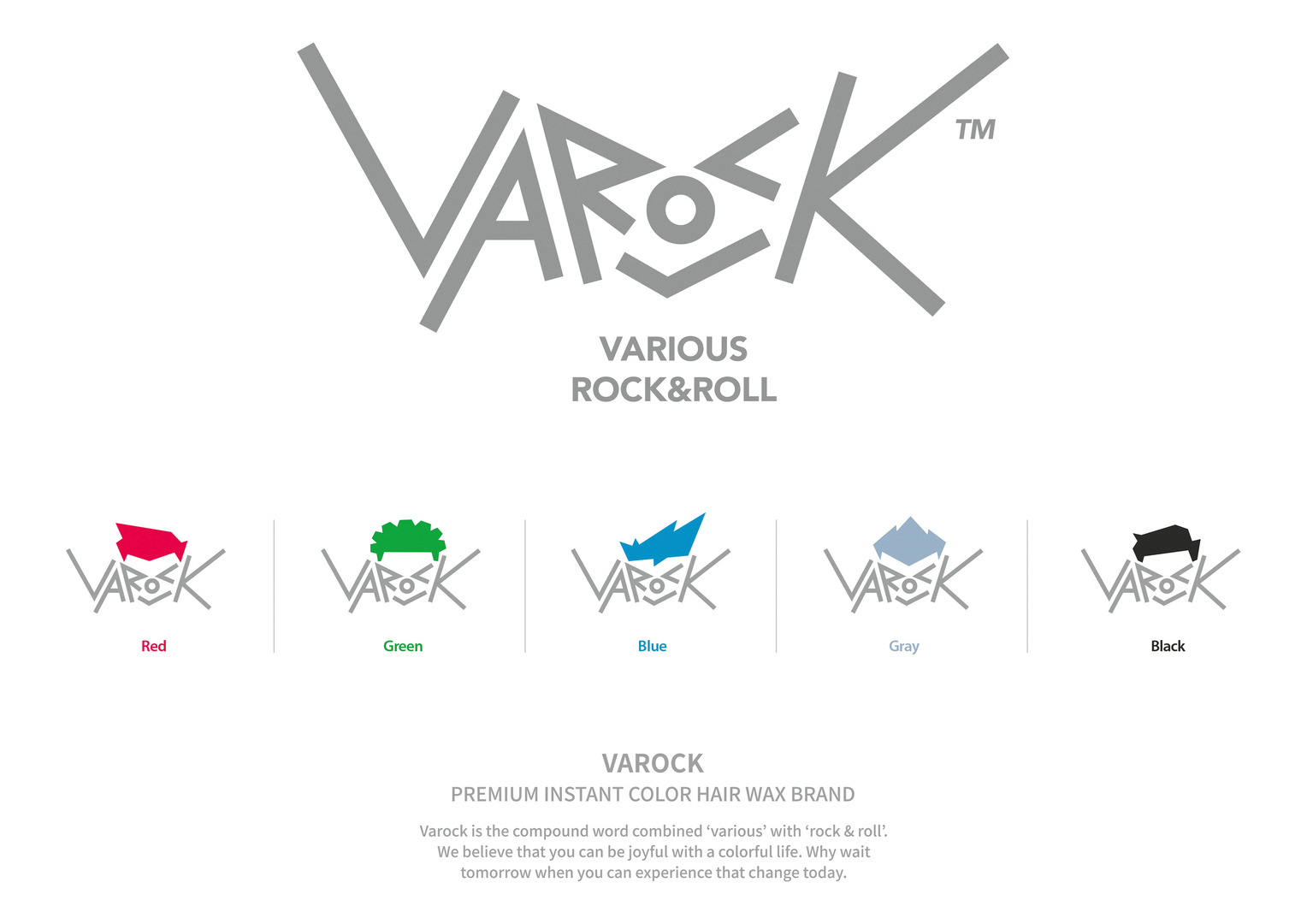 Varock is a premium instant colour hair wax, targeting US and Korean markets. The word mark is a compound word which combines “various” with “rock and roll”. The brand design is synonymous with a corresponding attitude to life, which is expressed through hairstyles in various colours. The flexible logo helps to distinguish between the different hair wax colours by using specific logo elements. The emblem comes in five different versions on packages and advertising motifs. In combination with recognisable imagery, which is used to showcase cool-looking people, the logo achieves the look and feel of a contemporary rock and roll style.