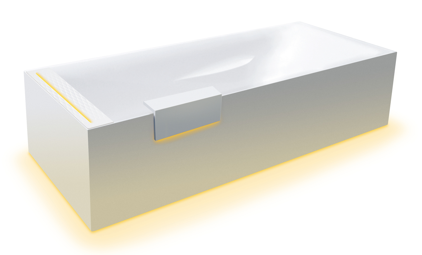 The harmonious blend of a surface inspired by nature and water gently cascading down into the basin like a small waterfall: soaking in this bathtub creates a therapeutical spa atmosphere, as it were. Hydro and air bubble jets provide for a beneficial massage. A storage shelf features a structured, anti-slip surface. It is easily shifted by means of a special magnetic mechanism. Light in different shades shines from under it.