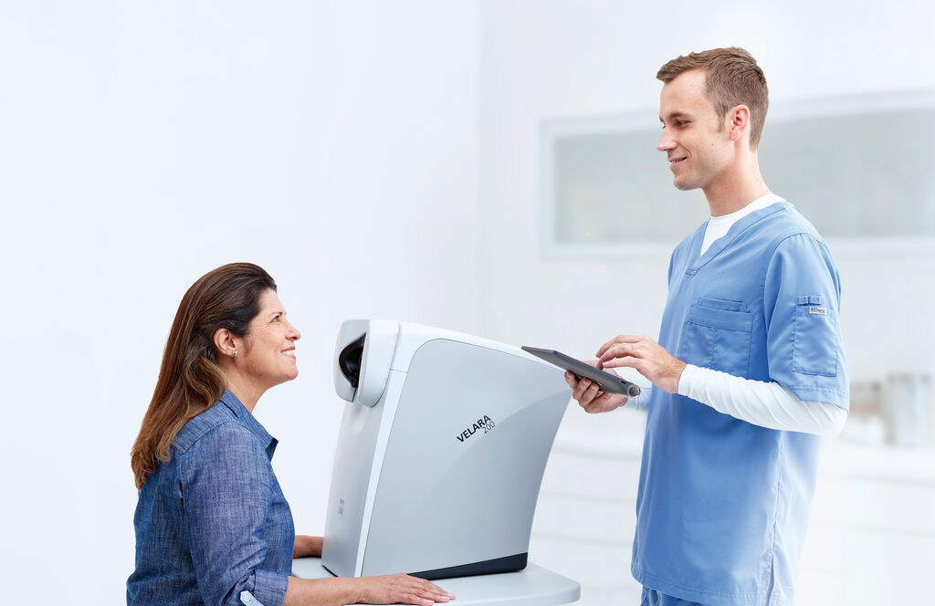 Unlike common retinal scanners with a structural separation of headrest and camera, the Velara 200 is based on a closed form, a sort of "camera obscura". This helps to avoid any impairment of the image quality caused by incidental ambient light. On the patient side, soft lines and a light colour scheme support a positive perception of the device. Furthermore, the body is slightly curved, which helps the patient to correctly align the head and the neck. As a special design quality, the jury emphasised the “distinctive look” of the design, resulting “from the contrast between the restrained box shape and the dynamically playful curves”.