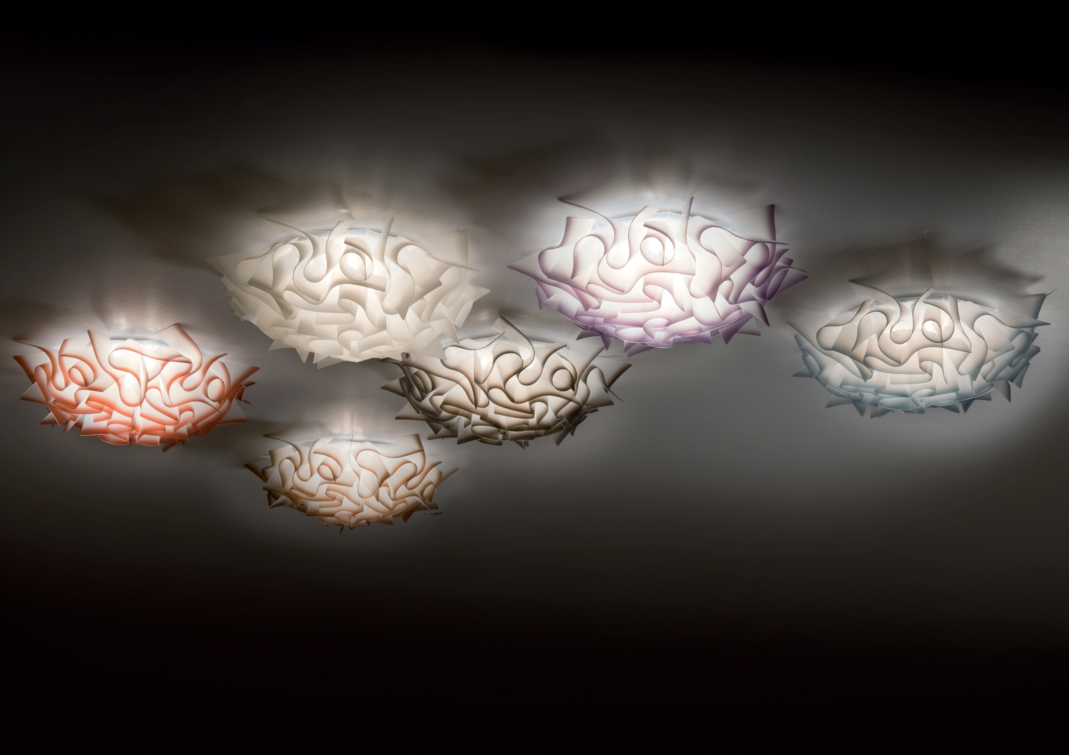 VELI is a lamp series without screws, whose crinkly plastic structures are bent by hand. The right-angled position of the single bends ensures that the lamp lights the room evenly. Another feature that guarantees good light diffusion is the fading effect on the coloured models. The lamp can quickly be mounted to a fixture by magnets and can also easily be removed for cleaning.
