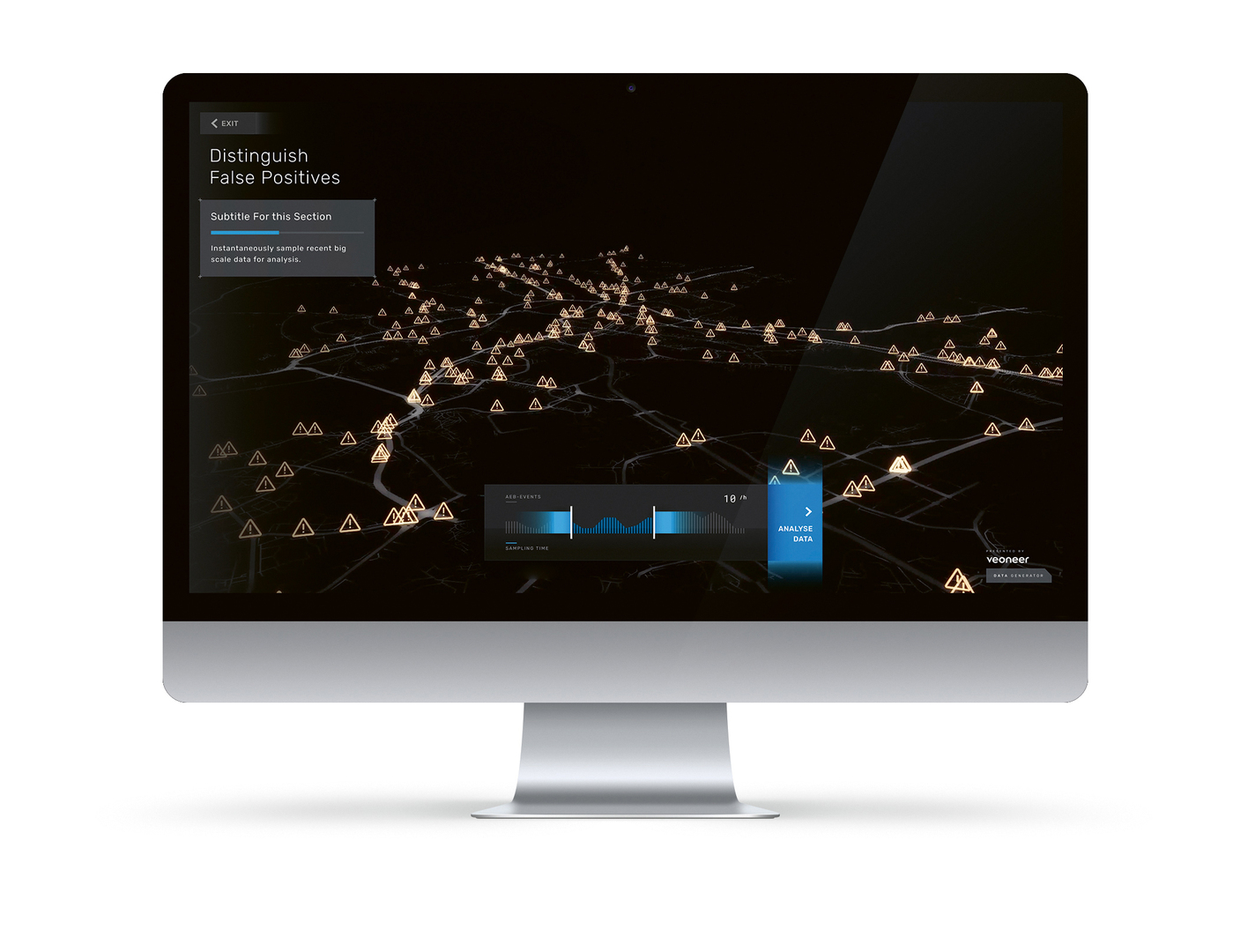 The Veoneer Data Visualiser showcased the demo “Collaborative Driving” at CES 2020, pointing out the significance of the two-way communication between user and vehicle for tomorrow’s mobility. Interactive scenarios allowed visitors to approach a large TV screen and navigate through various scenes, each demonstrating different ways of how data insights can contribute to a safer and better driver experience. Additional key elements included accumulated data visualisation, a live data display and in-car demo apps, showcasing both existing and futuristic car features.