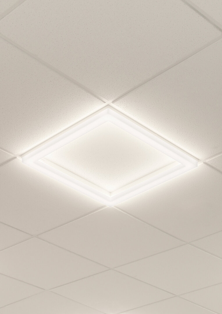Verge LED is versatile ceiling light for work and hospitality areas. It can be installed on grid or built-in ceilings, or suspended at different heights. The ceiling light completes itself with the architectural elements of the space it is going to belong to, creating unique volumetric lighting experience. It blends in innovatively, capturing the essence of any space. A carefully thought through LED configuration as well as the thermal management with the aluminium housing ensure a highly efficient supply of light. It can be easily maintained by removing the central tile.