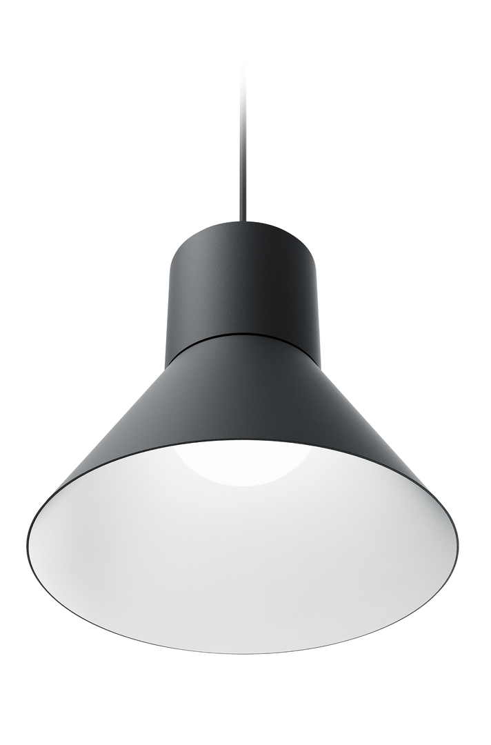 Verner is a minimalist pendant luminaire which combines considerable light output with geometric aesthetics. It has been designed for high ceilings and open spaces where only little attention is to be directed towards the ceiling. The cone-shaped lampshade ensures that the glare-free light is directed downwards, intentionally avoiding the indirect illumination of the ceiling. The standard version of the LED light source reaches 2,400 Lumens while the high output model delivers over 4,200 Lumens.