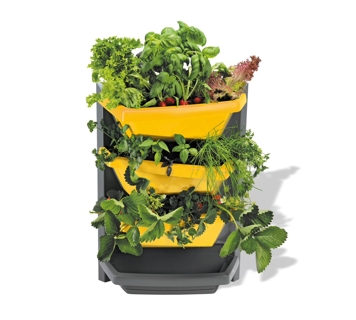 Vertical Garden is a modular planting system for balconies, terraces and walls, but also for interior spaces. It can be assembled quickly and easily and enables the growing of herbs, lettuce, cocktail tomatoes, strawberries and flowers. Its watertight back panel protects the wall from moisture. Each panel supports three planters and a drip tray in any arrangement. Vertical Garden can either be attached to a wall, set up on a base or placed back to back as a screen to subdivide rooms.