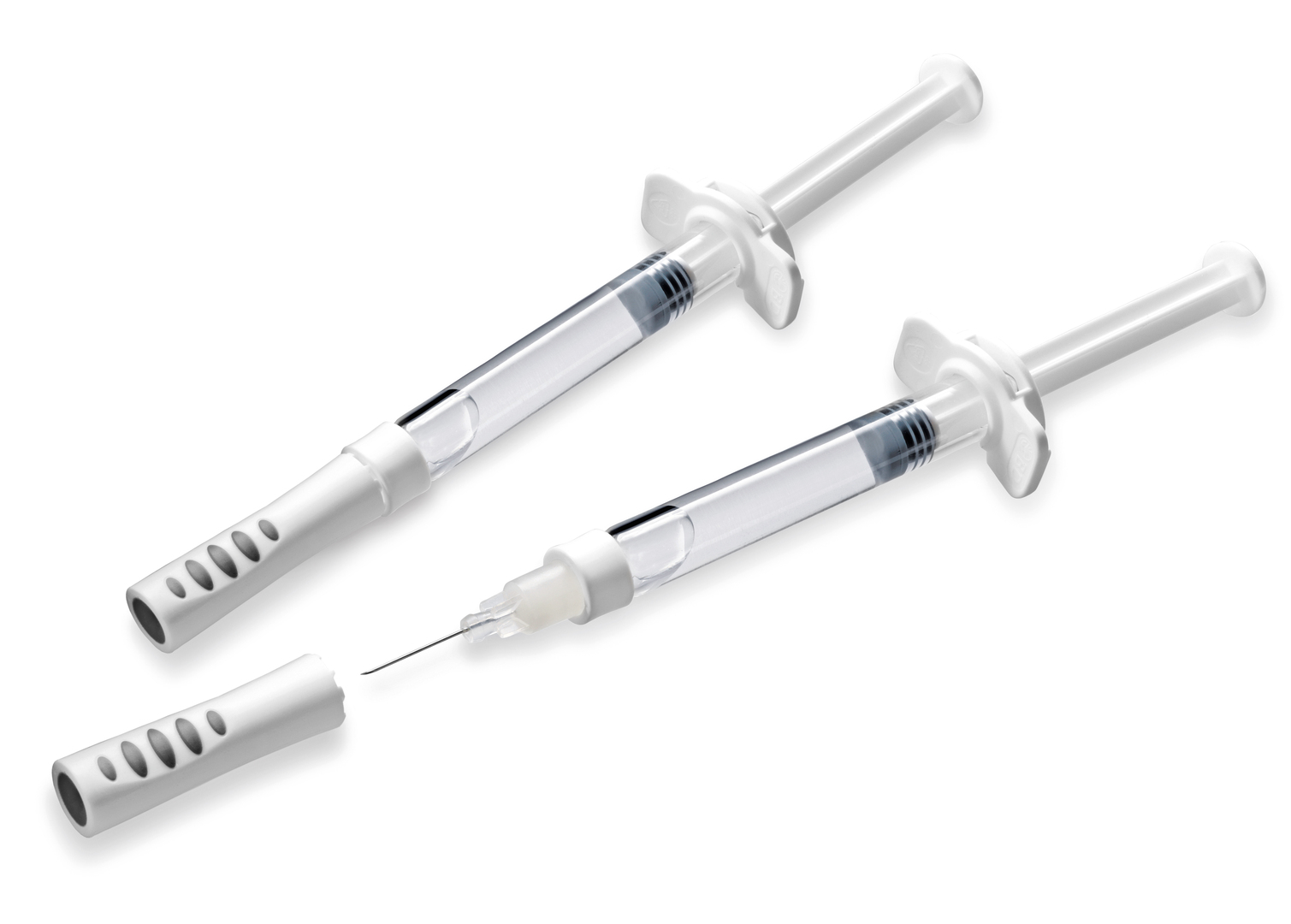 Vetter-Ject is a closure system for pre-filled syringes. It consists of a piston that is crafted from three different plastic components and the steel injection needle glued inside. The piston with the needle is attached to a syringe and serves, for one, as a safety catch, but also as an indicator that the syringe is unused. The closure system’s grey plastic component is permeable so that the superheated steam reaches the needle during the sterilisation process. At the same time, the material functions as a non-slip layer when opening the closure system.