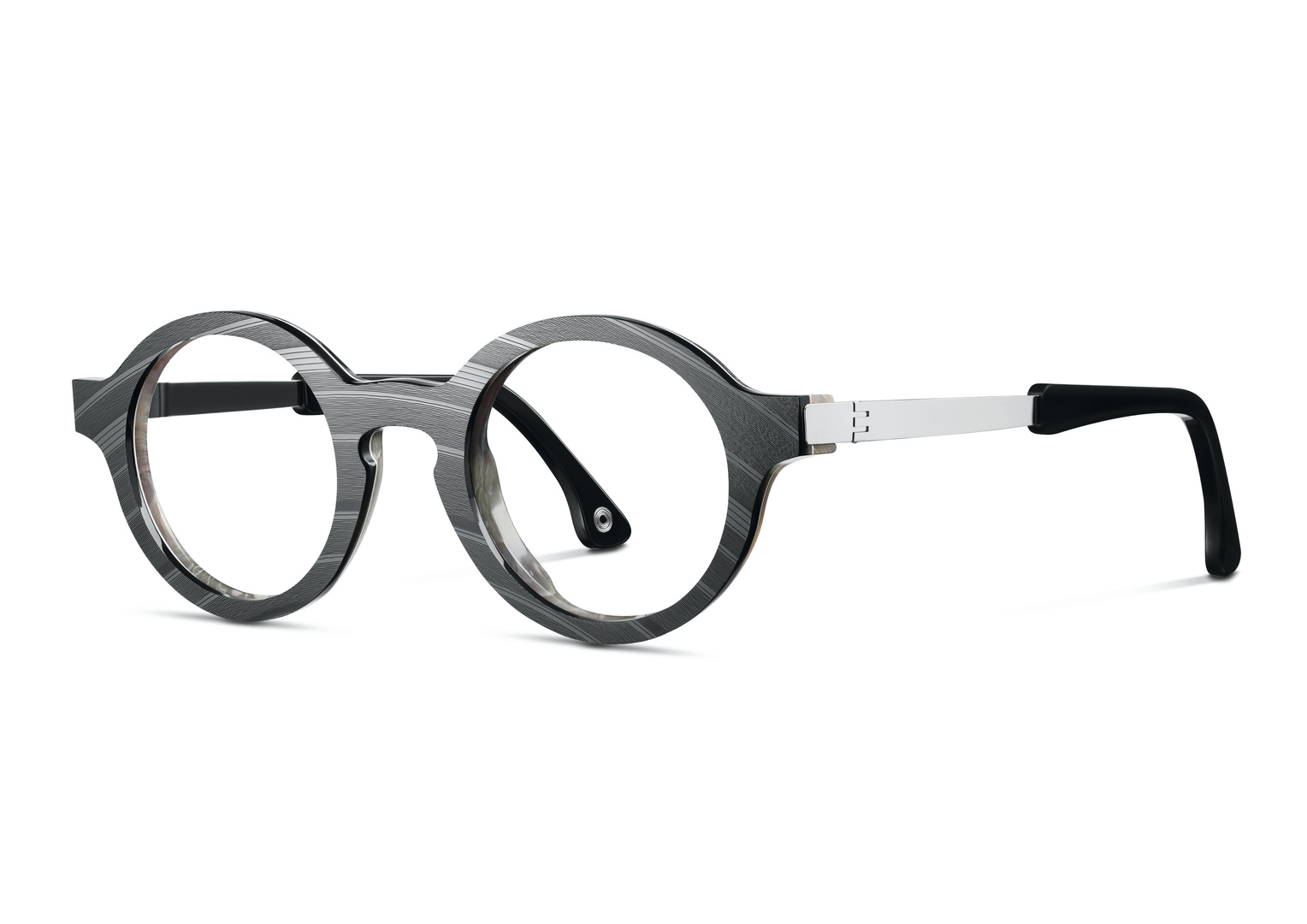 Vinylize Ashby are glasses made of old vinyl records. A special production process makes it possible to fuse vinyl and cellulose acetate. As these two synthetic materials age and shrink at different rates, the frame changes over time and becomes rather concave in shape, making them even more comfortable to wear. The glasses are predominantly black in colour with a textured surface that shows noticeable grooves and lines. The temples, made of palladium plated matt metal, are easy to adjust.